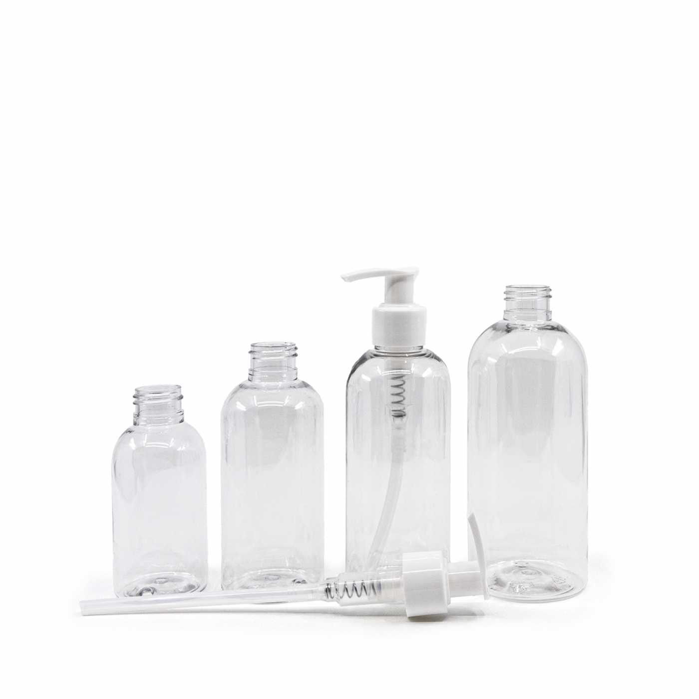 Átlátszó, kerek műanyag palack fehér adagolóval, 100 ml