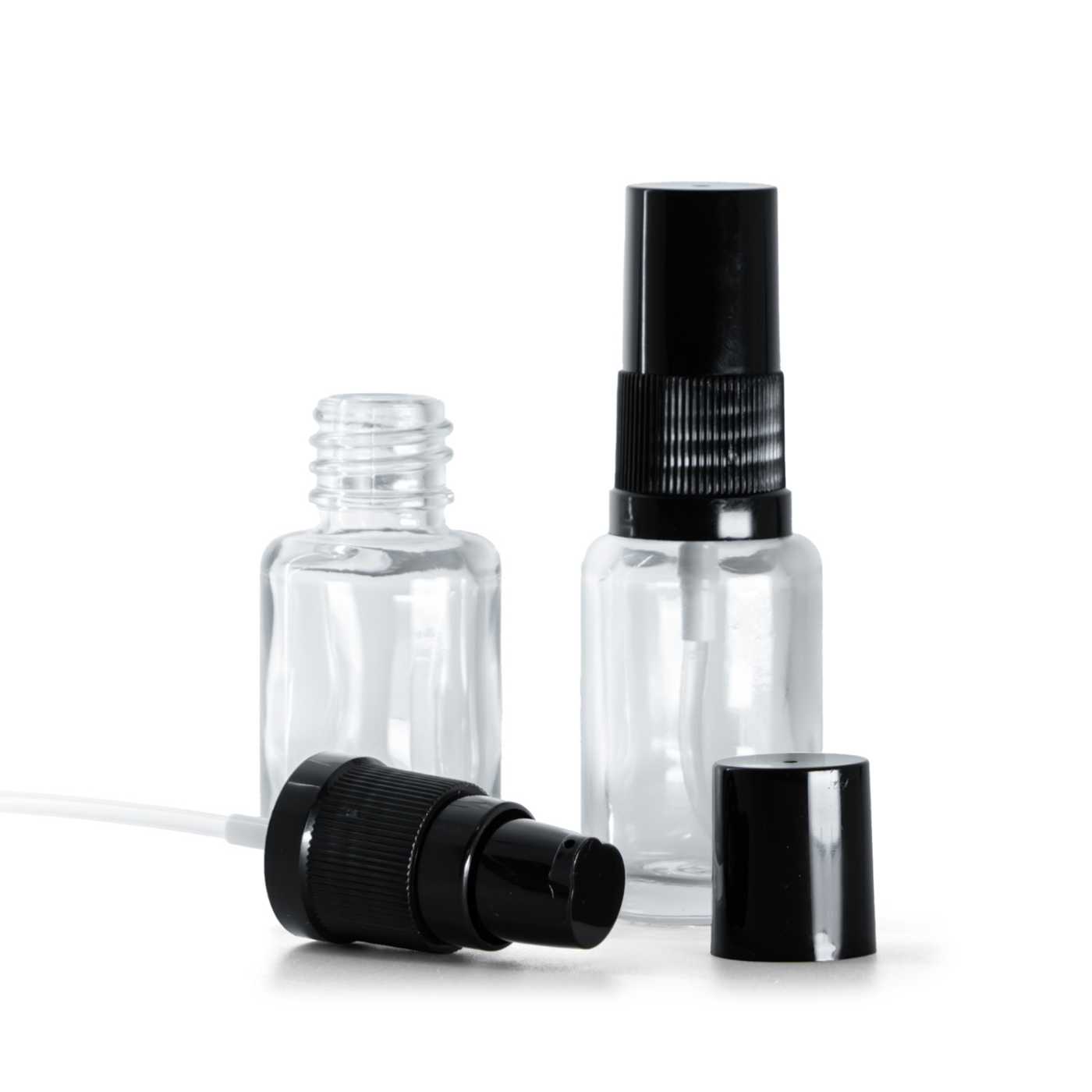 Átlátszó, kerek üvegpalack fekete krémadagoló pumpával és fekete kupakkal 12 ml