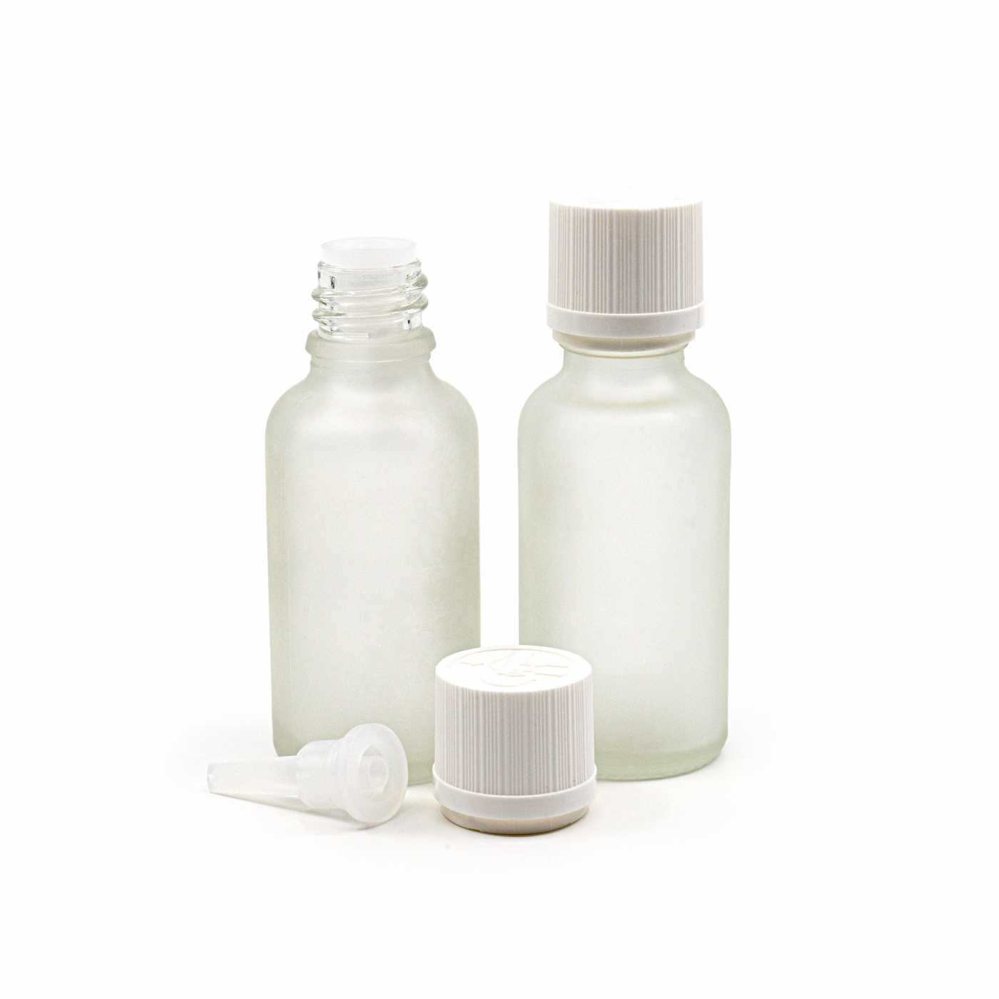 Átlátszó matt üvegpalack, fehér garanciazáras cseppentős kupakkal, 30 ml