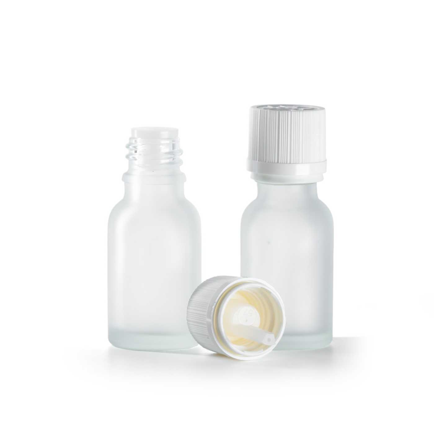 Átlátszó matt üvegpalack, fehér garanciazáras cseppentőzár, 15 ml
