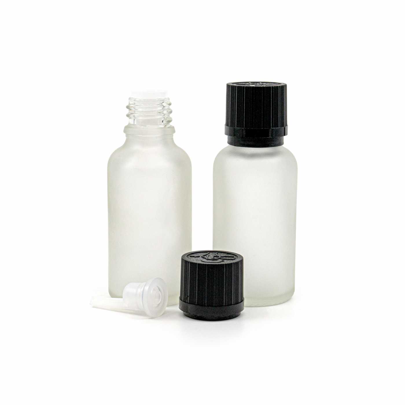 Átlátszó matt üvegpalack, fekete biztonsági kupak cseppentőbetéttel, 30 ml