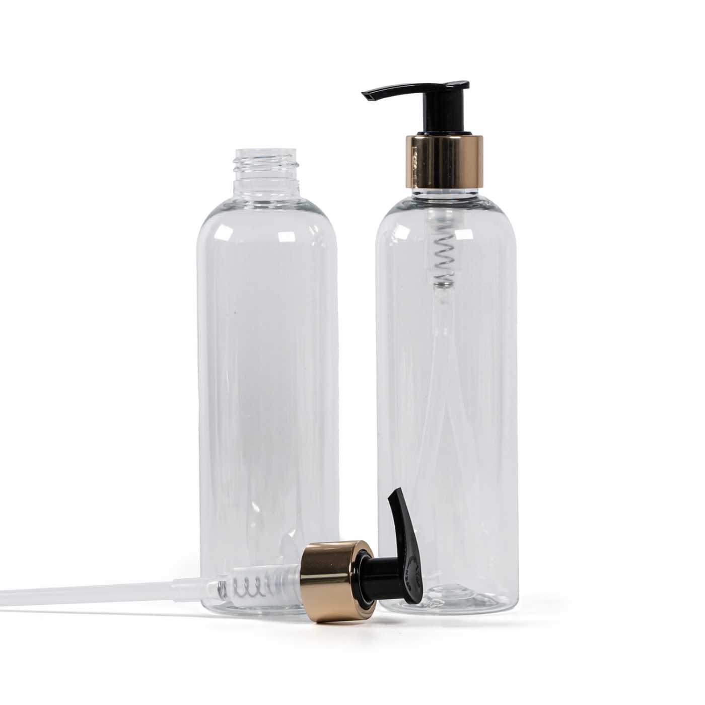 Átlátszó műanyag palack, arany adagolószivattyú, 250 ml