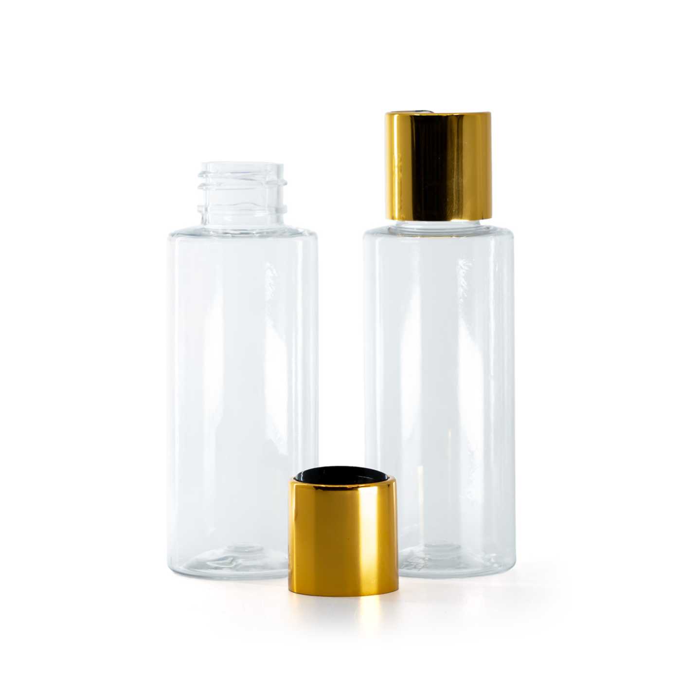 Átlátszó műanyag palack, disc-top kupak, arany gallér, fekete betéttel, 100 ml