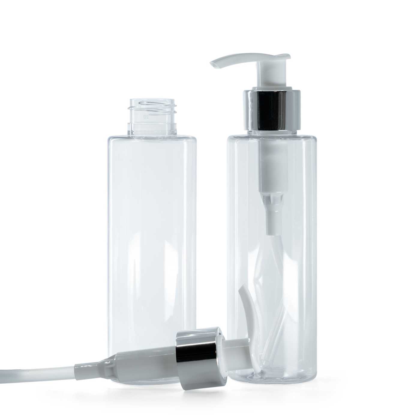 Átlátszó műanyag palack, fehér adagoló fényes ezüst gallérral, 150 ml