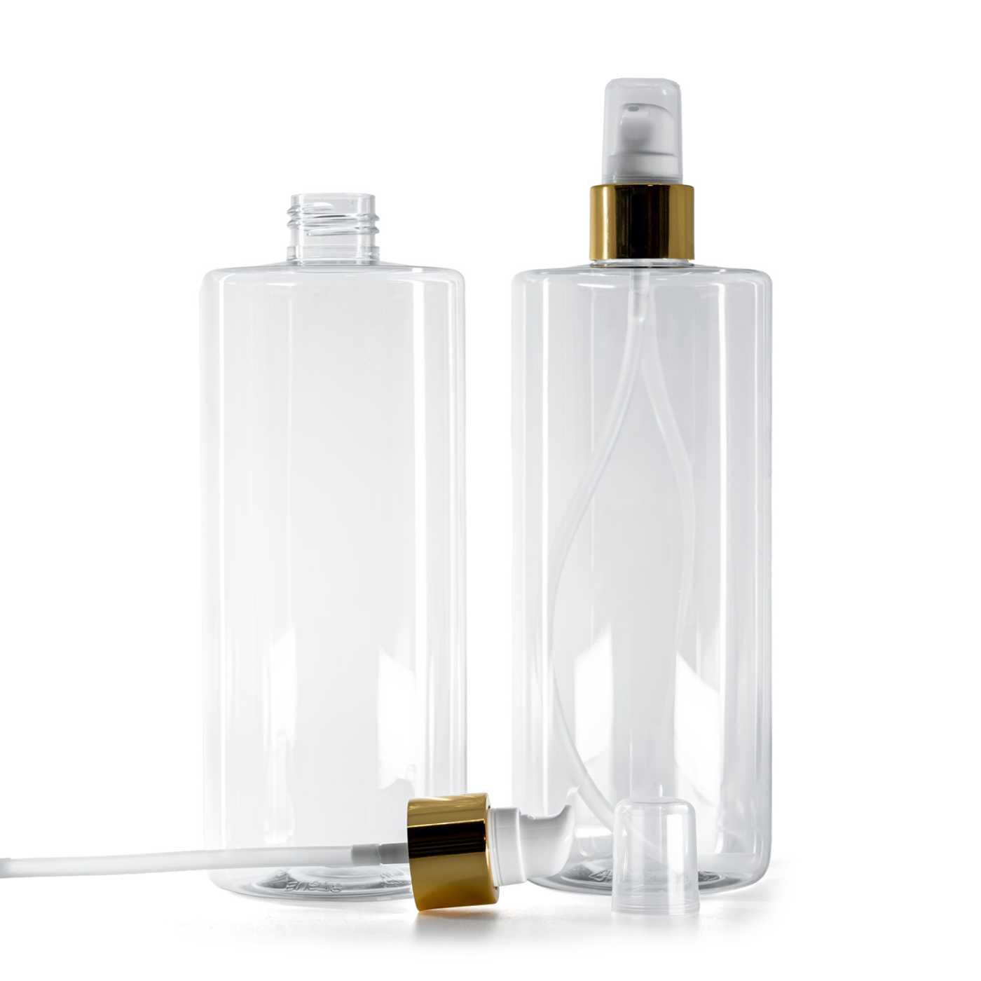 Átlátszó műanyag palack, fehér adagolópumpa kupakkal, fényes arany, 500 ml