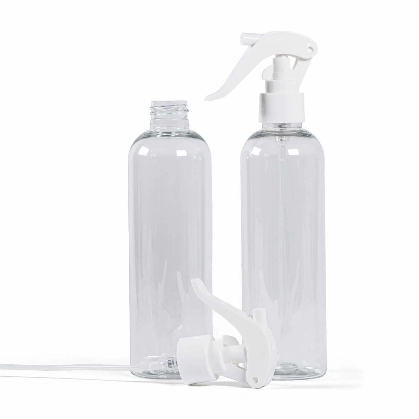 Átlátszó műanyag palack fehér trigger permetezőfejjel 250 ml