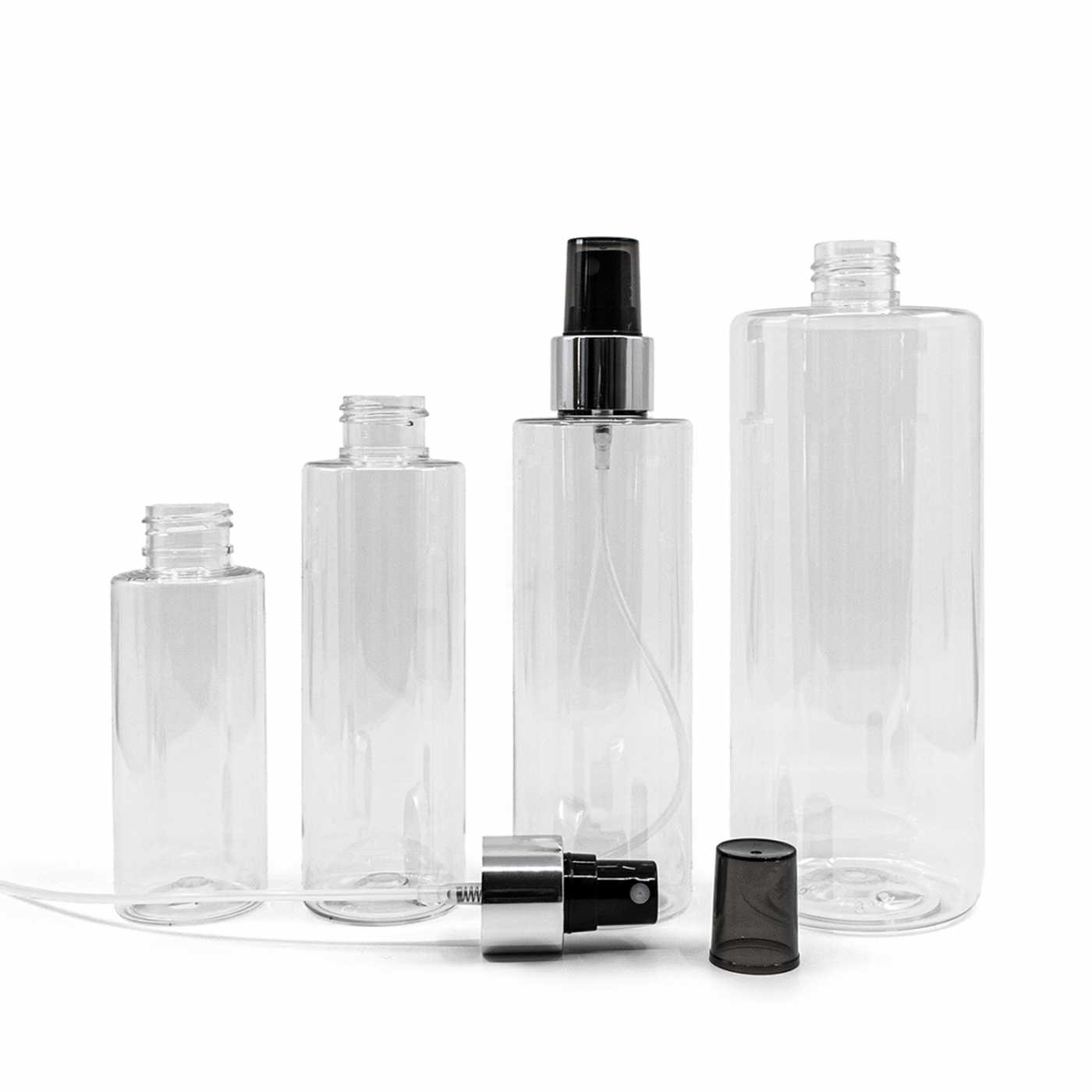 Átlátszó műanyag palack, fekete permetezőfej fényes ezüst gallérral, 200 ml