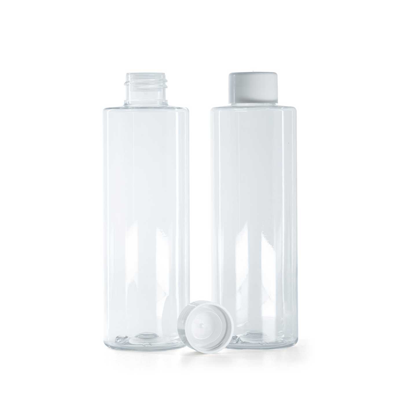 Átlátszó műanyag palack sima fehér kupakkal és adagolóbetéttel, 200 ml
