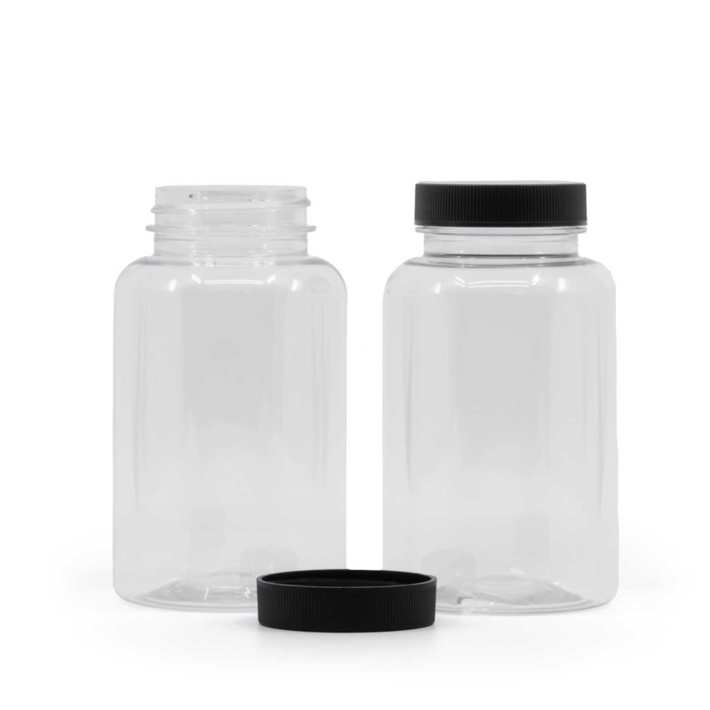 Átlátszó műanyag tablettatartó fekete kupakkal, 250 ml