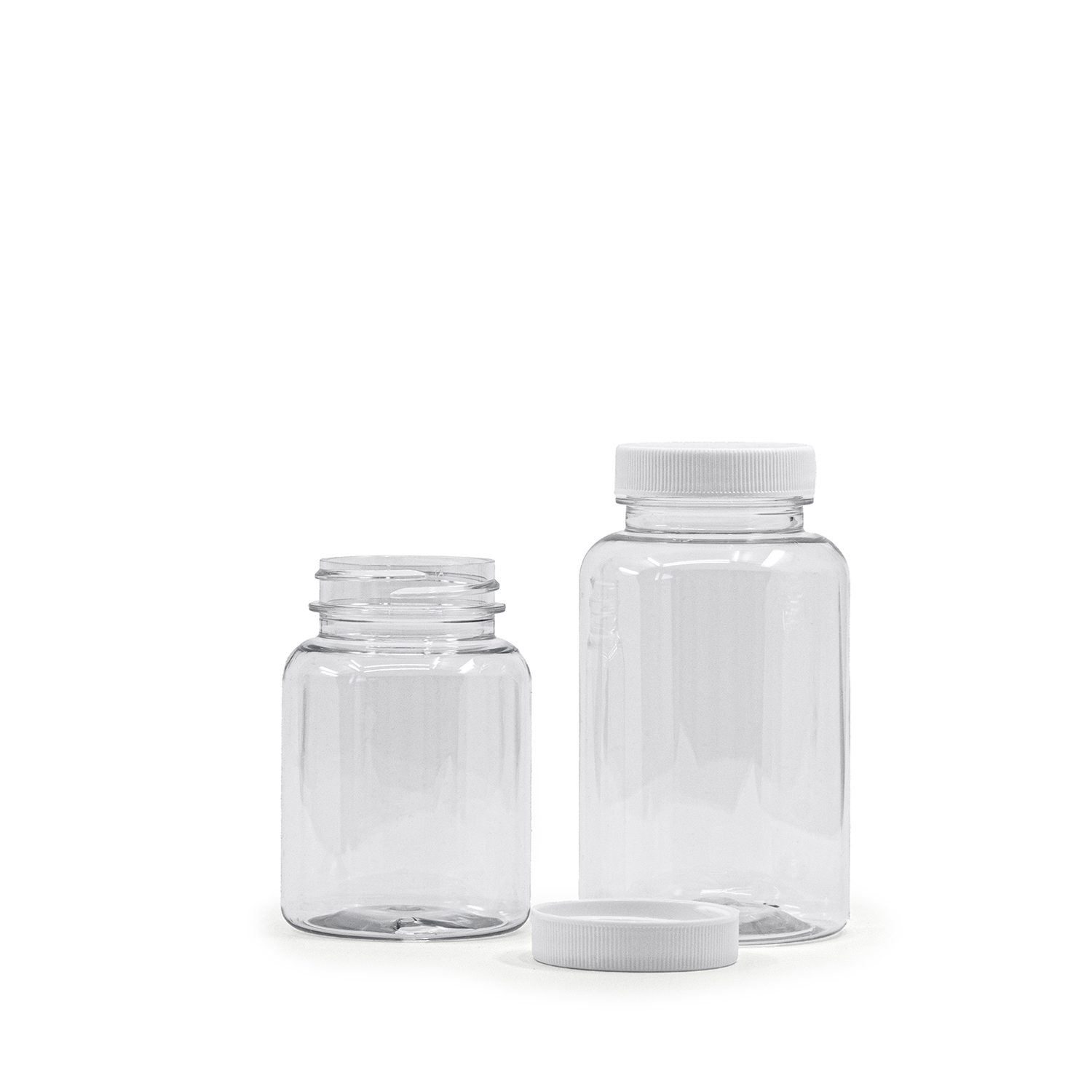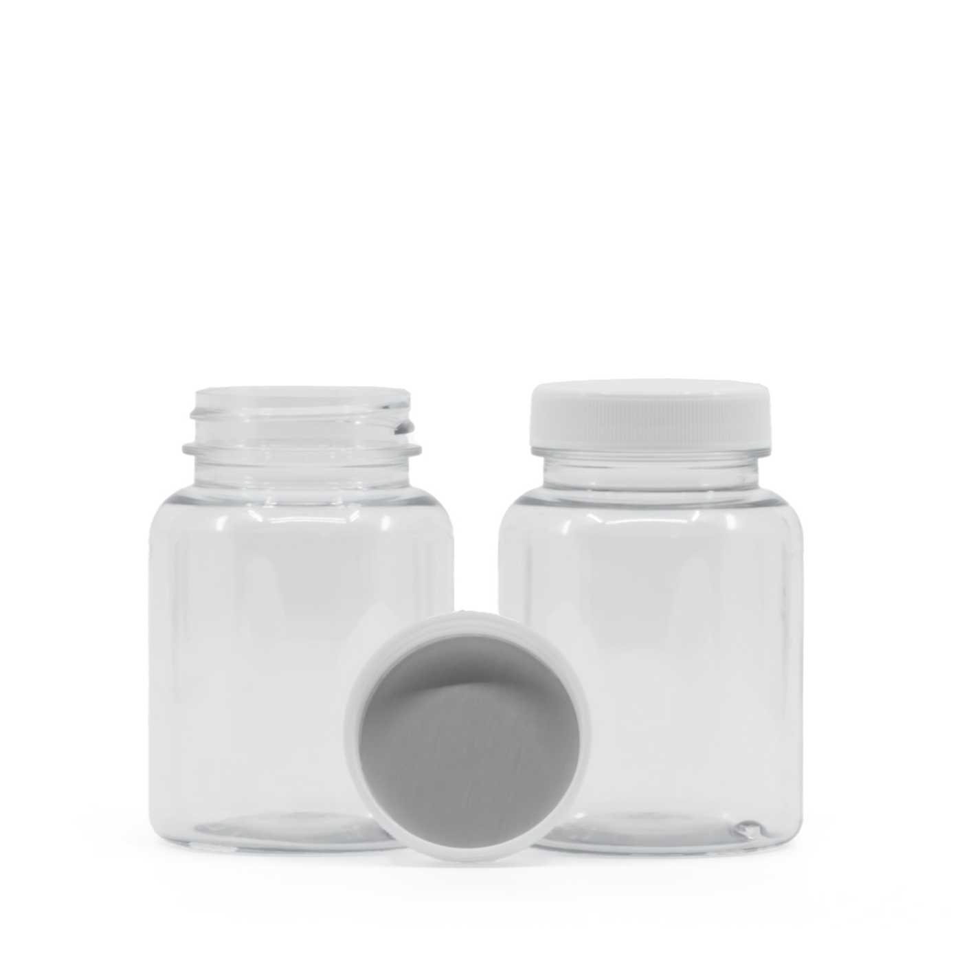 Átlátszó műanyag tablettatartó tégely, fehér kupak, indukciós zárófólia, 150 ml