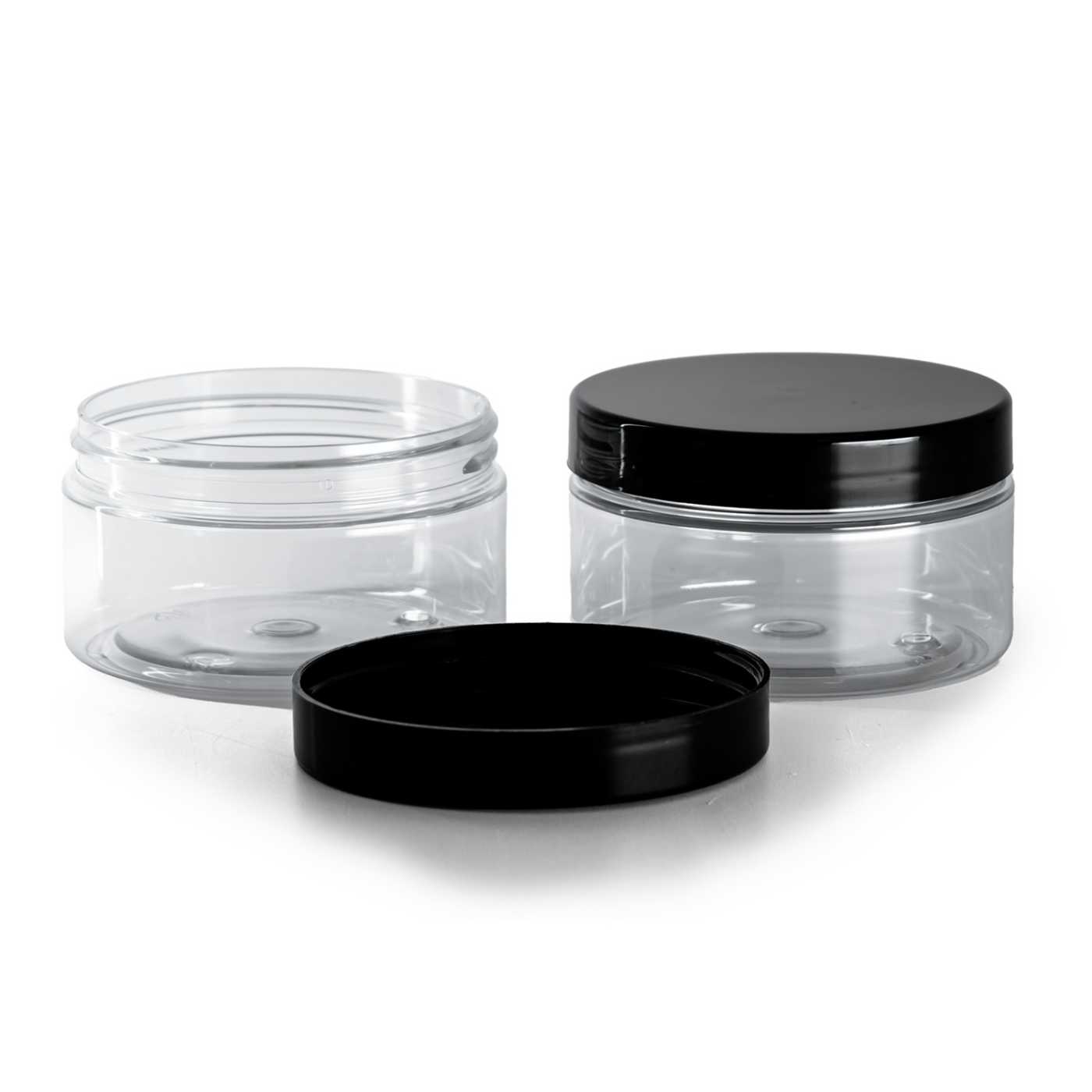Átlátszó műanyag tégely fekete kupakkal 100 ml