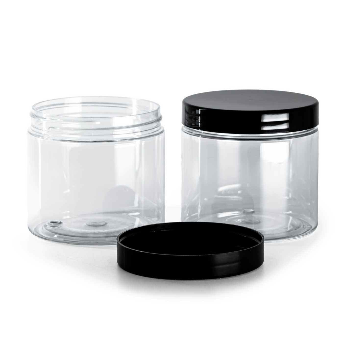 Átlátszó műanyag tégely fekete kupakkal 200 ml