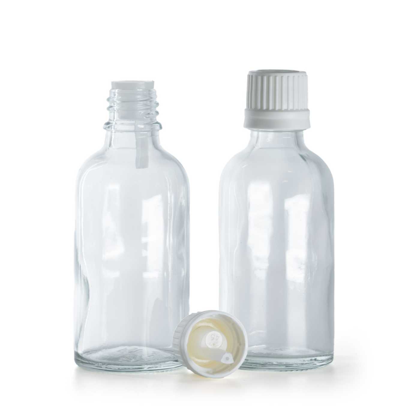 Átlátszó üveg cseppentős palack fehér, manipulációbiztos kupakkal, 50 ml