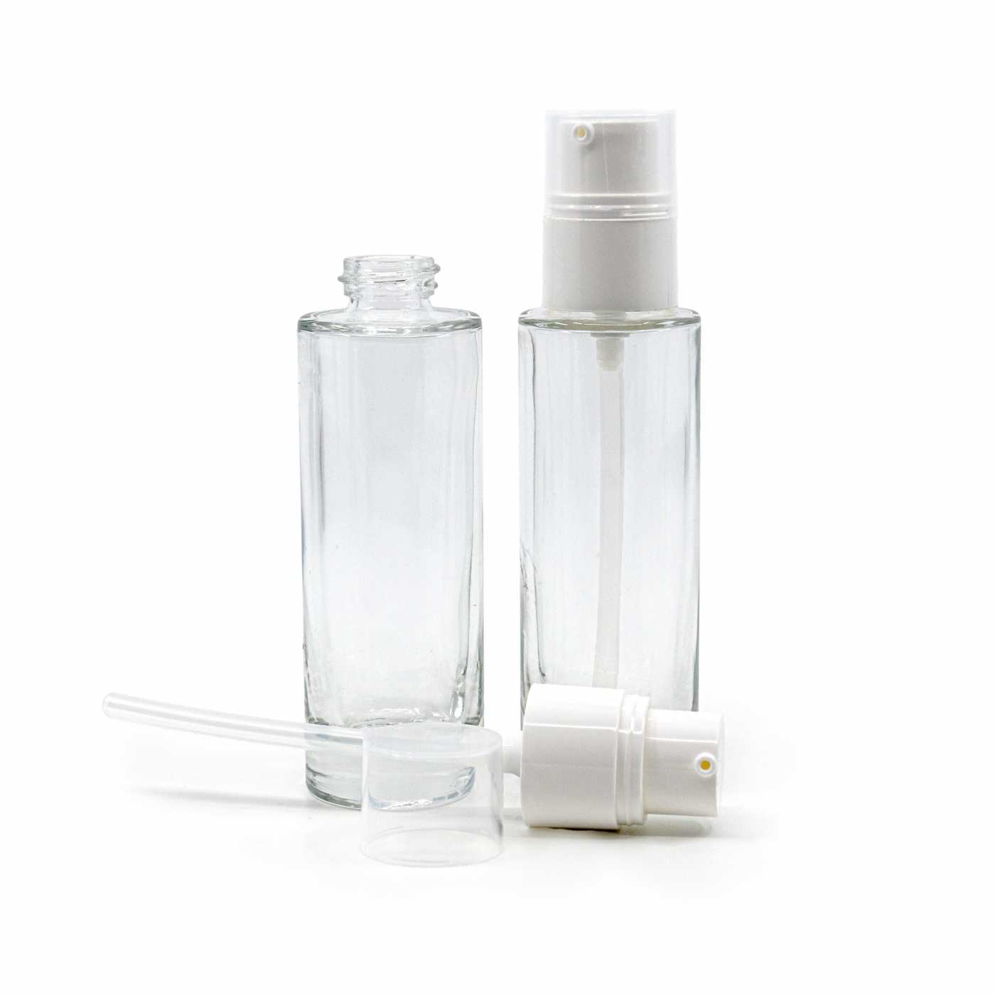Átlátszó üvegpalack, fehér adagoló, 30 ml
