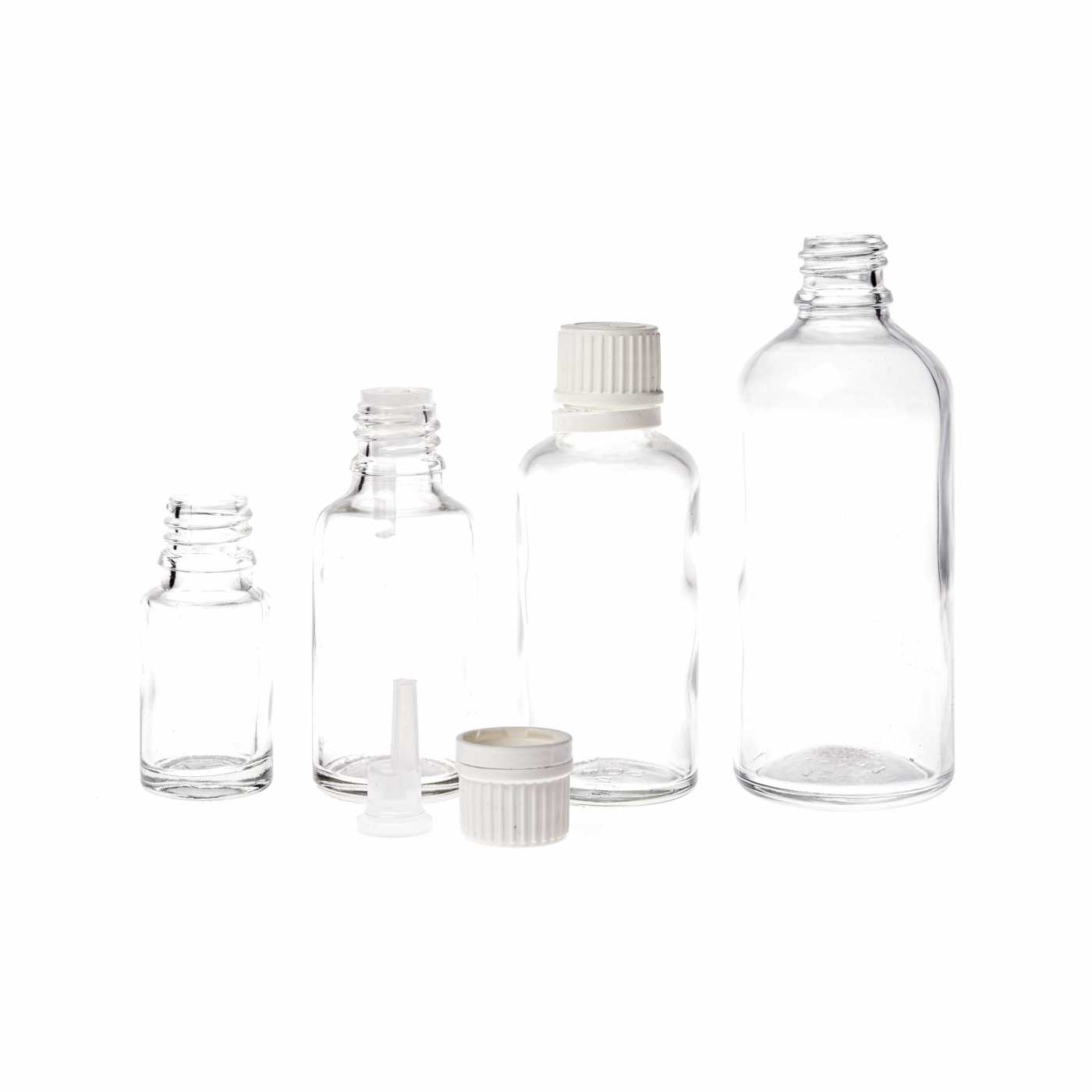 Átlátszó üvegpalack, fehér manipulatívzáras kupak cseppentővel, 30 ml