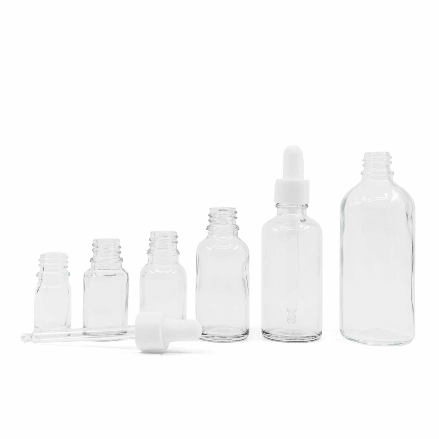 Átlátszó üvegpalack, fehér matt cseppentős kupak, 30 ml