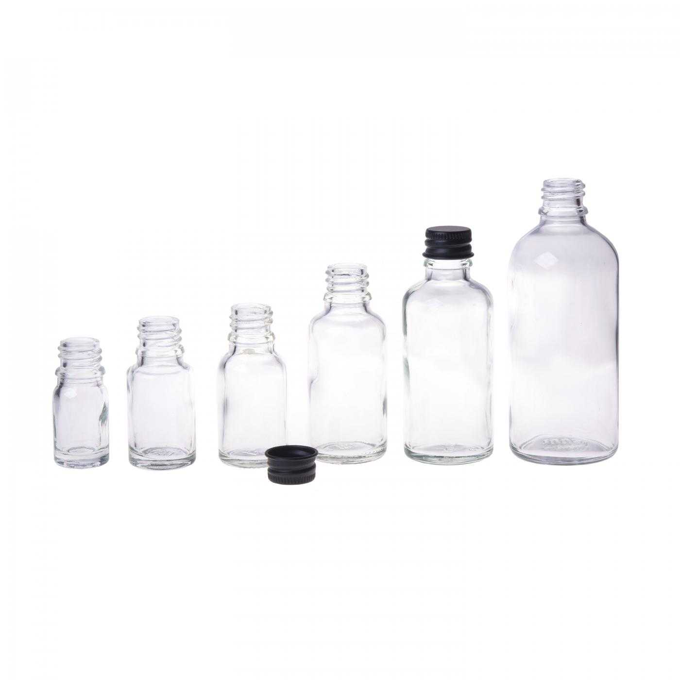 Átlátszó üvegpalack, fekete alumínium kupak, 50 ml