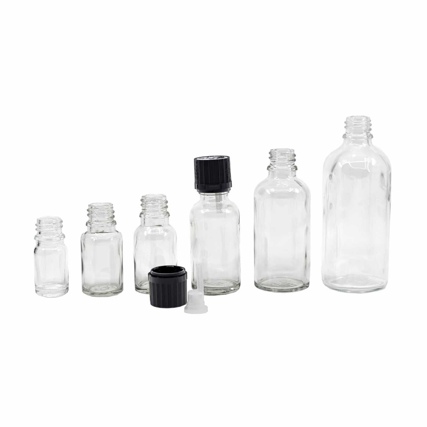 Átlátszó üvegpalack, fekete biztonsági kupak cseppentőbetéttel, 30 ml