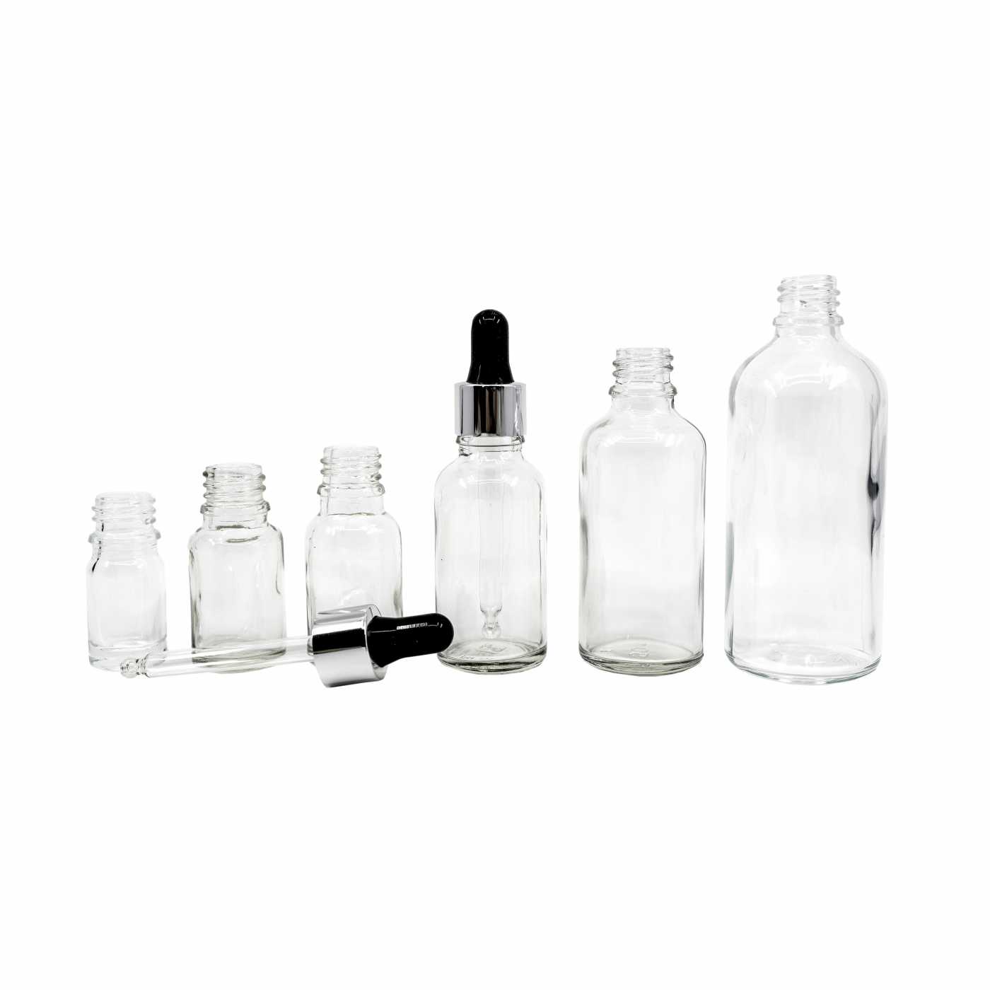 Átlátszó üvegpalack fekete-ezüst pipettás kupakkal 10 ml