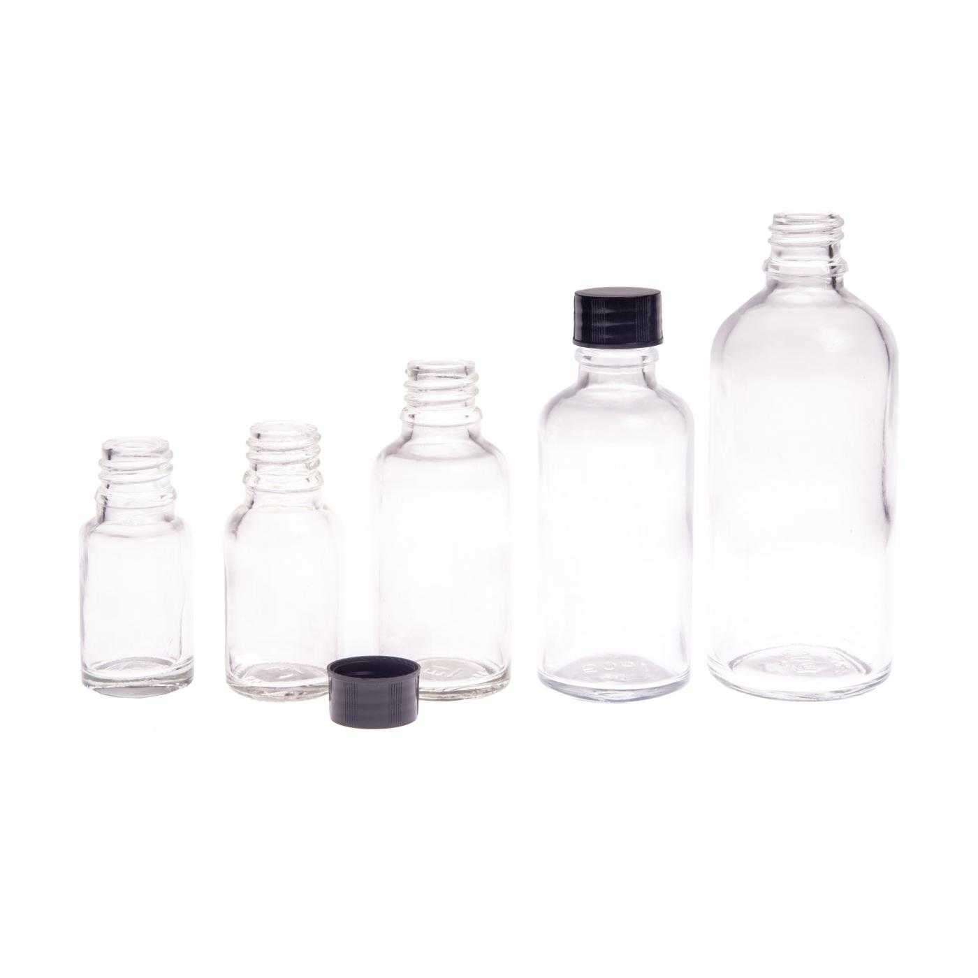 Átlátszó üvegpalack fekete kupakkal 30 ml