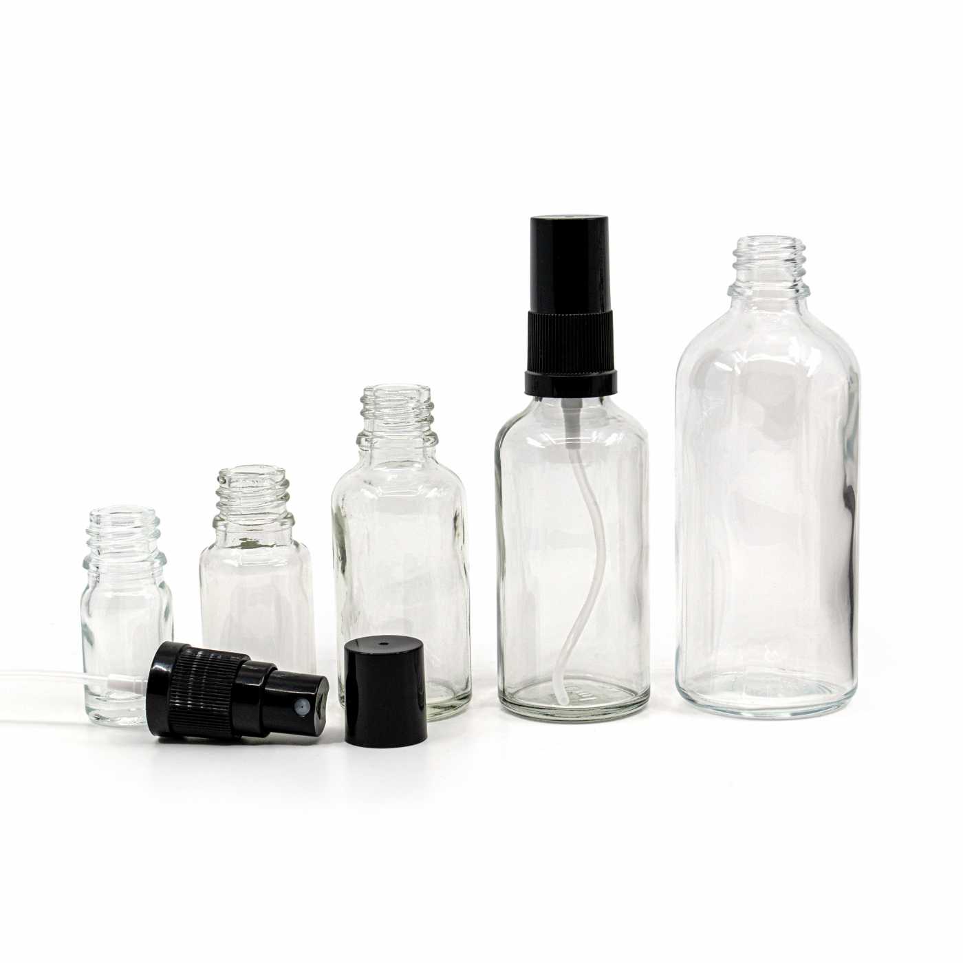 Átlátszó üvegpalack, fekete permetezőfej, fekete kupak, 30 ml