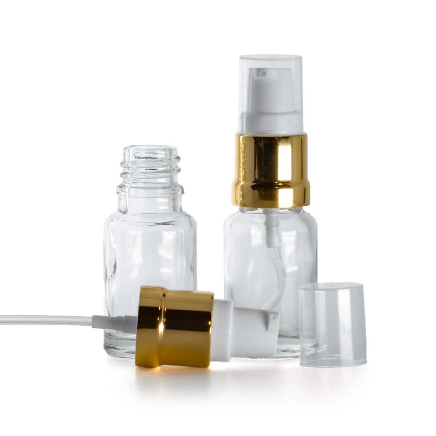 Átlátszó üvegpalack, fényes fehér-arany pumpa, 10 ml