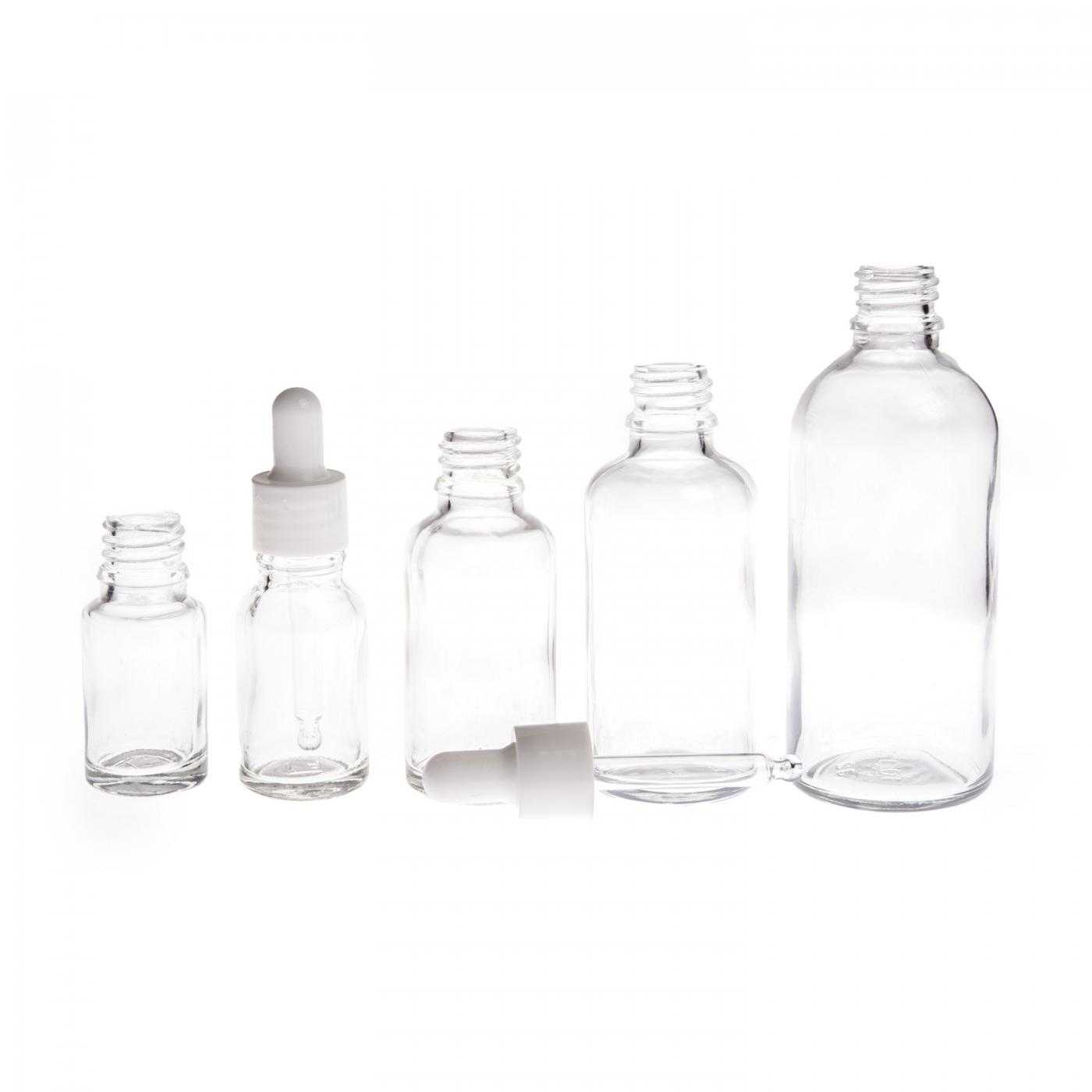 Átlátszó üvegpalack, fényes fehér pipetta, 15 ml
