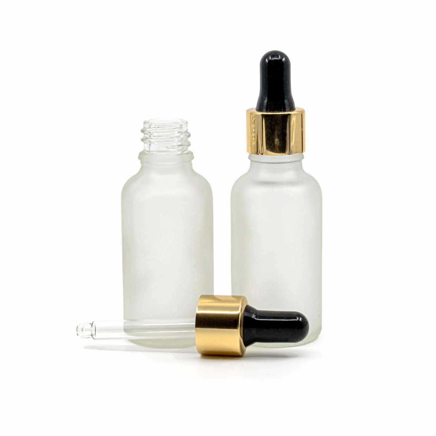 Áttetsző fagyasztott üvegpalack fekete-arany pipettás kupakkal, 30 ml