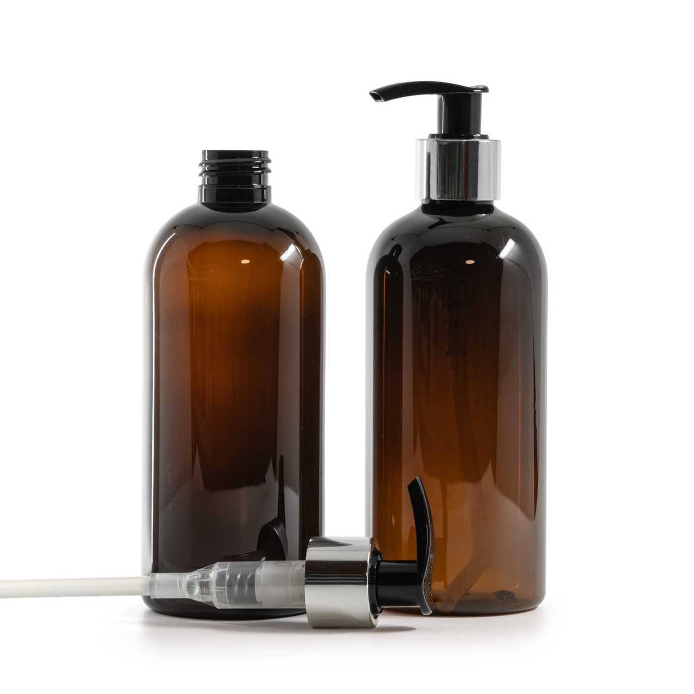 Barna műanyag palack fekete adagoló pumpával és fényes ezüst gallérral 300 ml