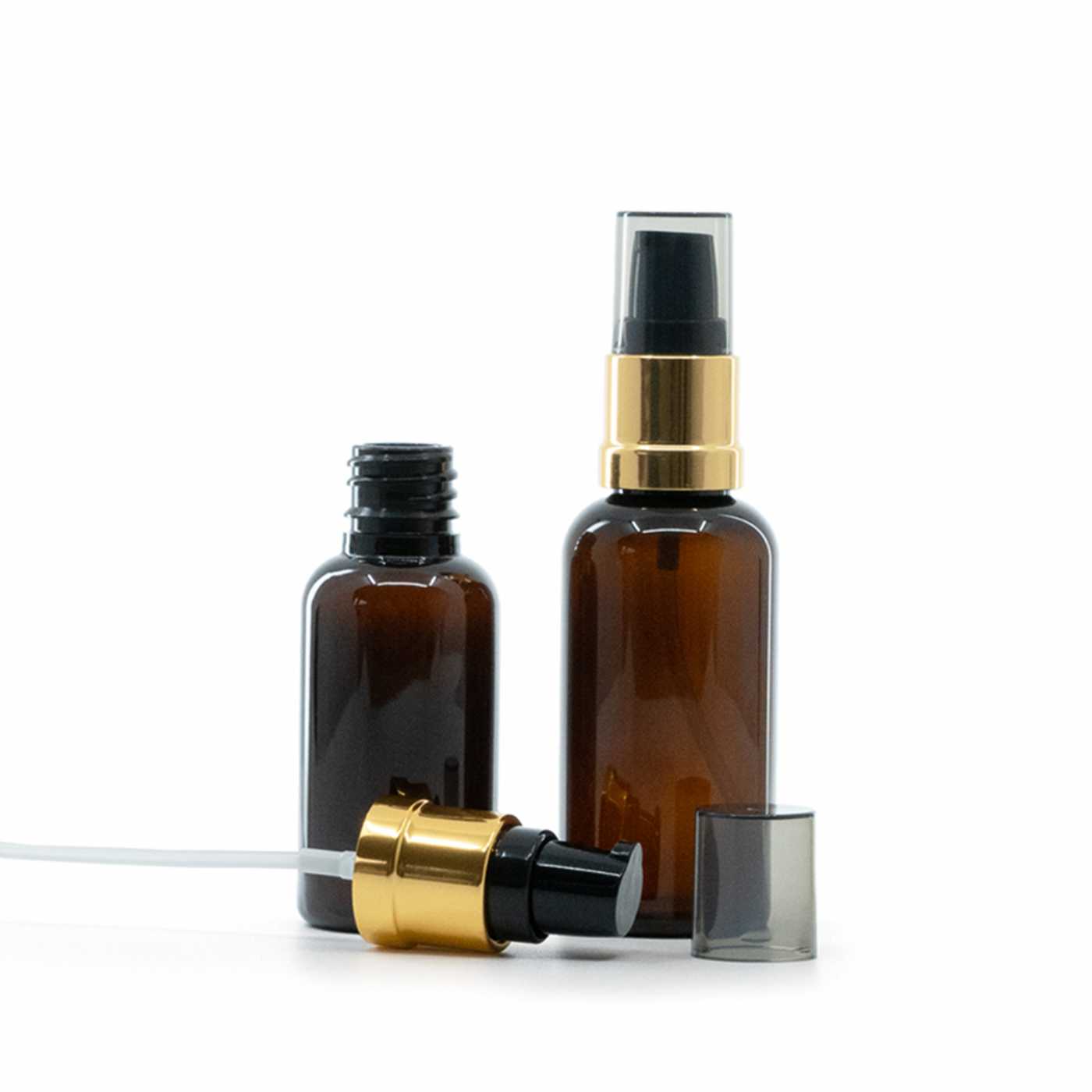 Barna műanyag palack fekete-arany fényes adagolóval, 30 ml