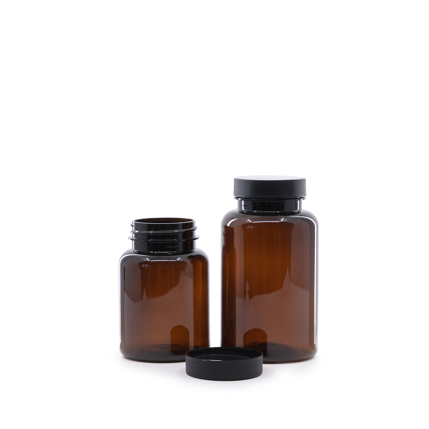 Barna műanyag tablettás tégely, fekete kupak, indukciós zárófólia, 250 ml