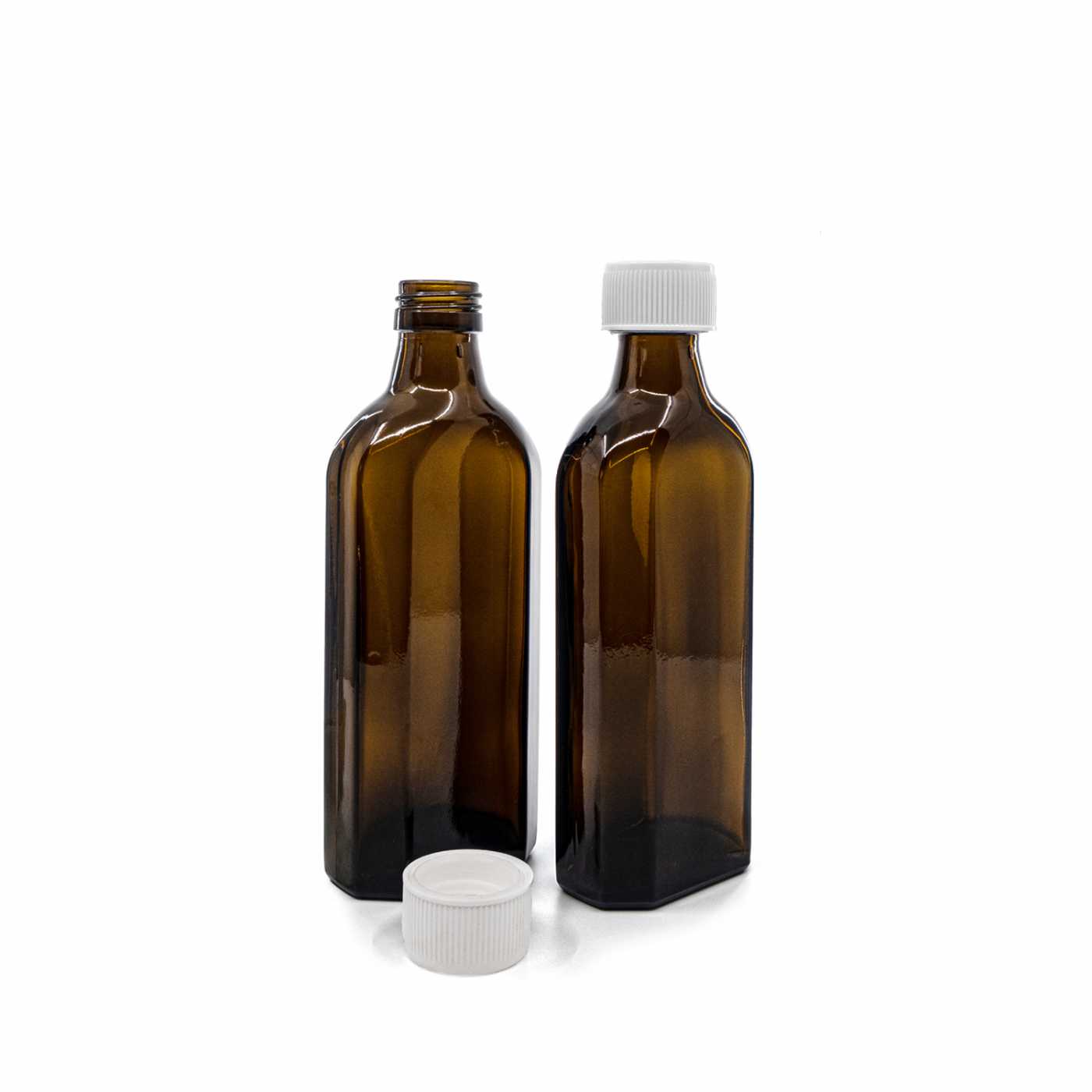 Barna, téglalap alakú orvosi üvegpalack, PP28, 250 ml, fehér biztonsági kupak