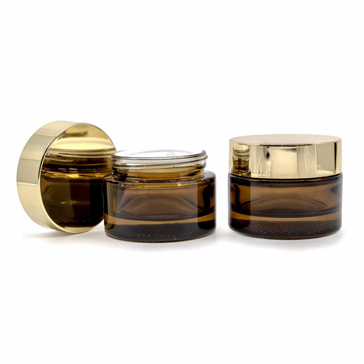 Borostyánszínű üveg tégely, arany kupak, 50 ml