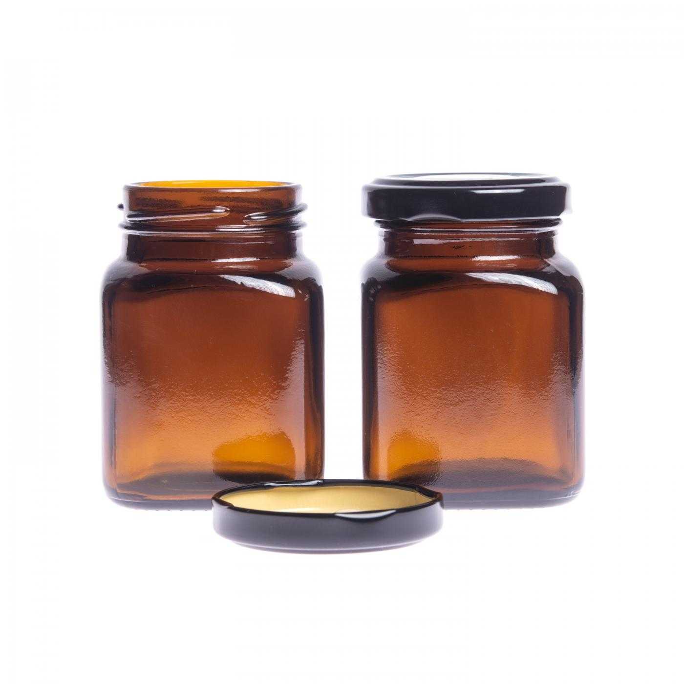 Borostyánszínű üveg tégely, fekete műanyag kupak, 155 ml