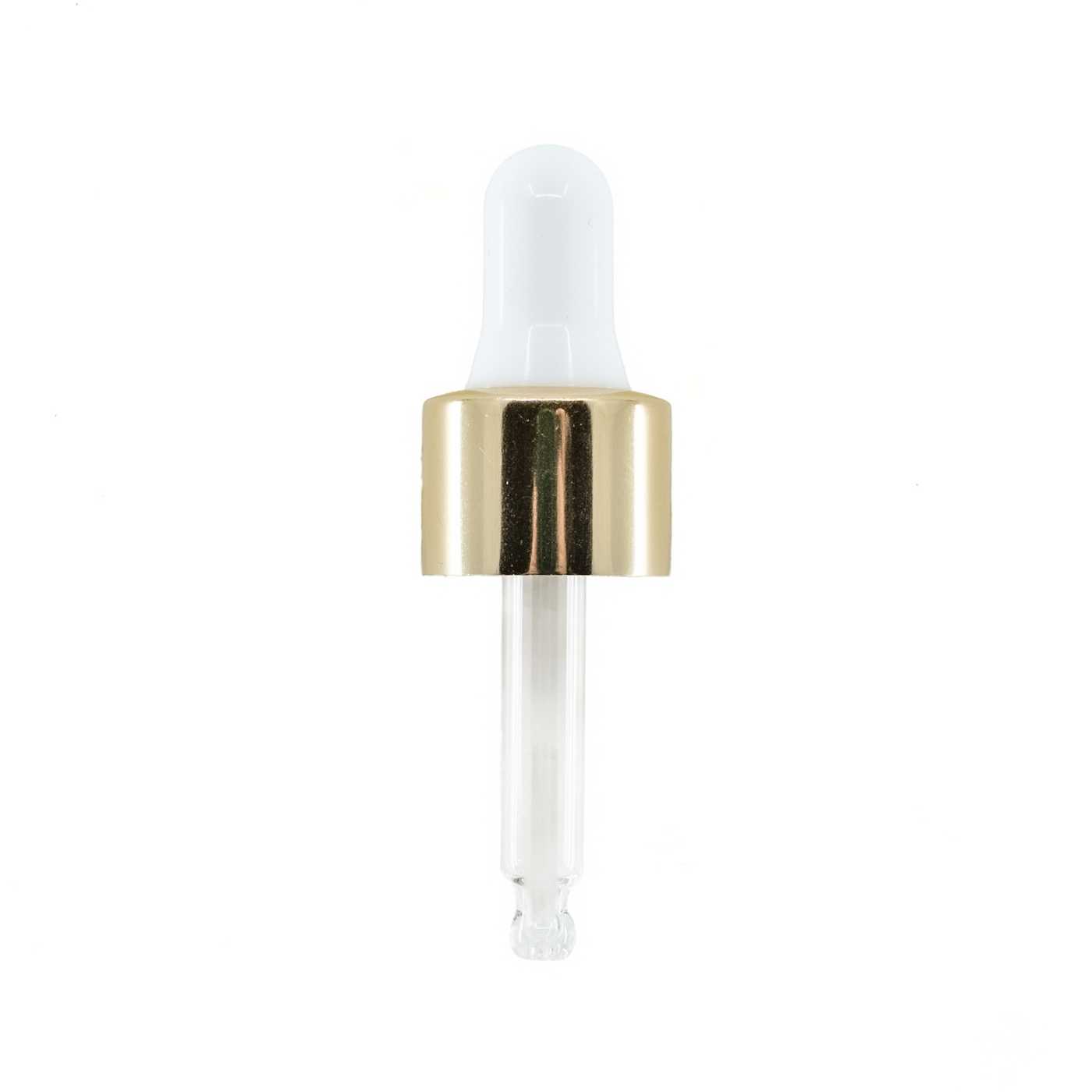Fehér/arany kombinációjú üvegcseppentő, amely 18 mm nyakátmérőjű és 5 ml térfogatú üveghez használható.