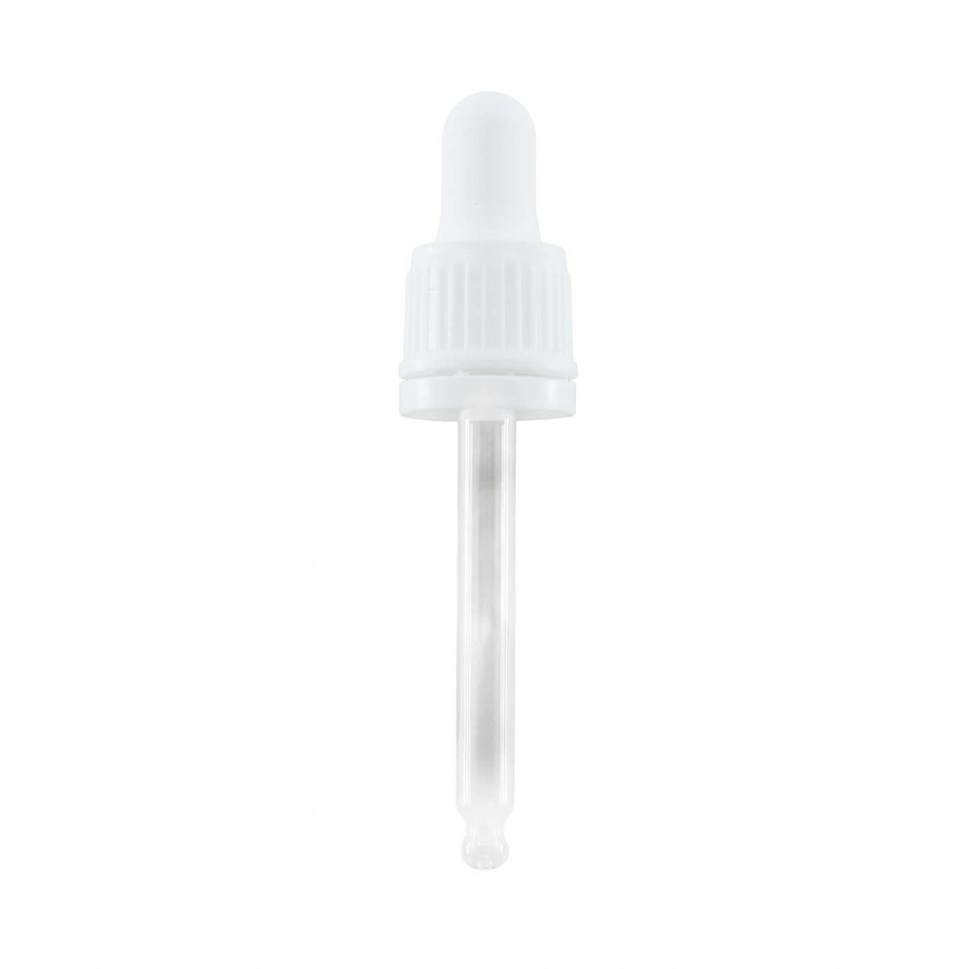 Fehér műanyag cseppentő, 18 mm nyakátmérőjű és 30 ml térfogatú üveghez.Az üvegcső hossza: 71 mm