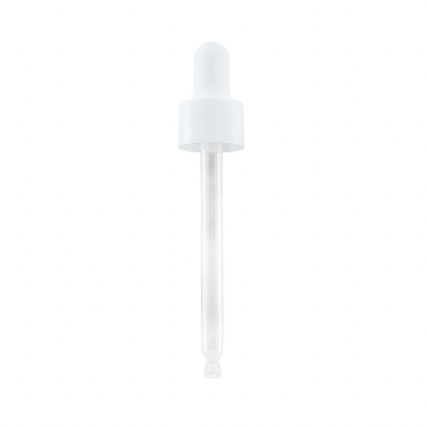 Fehér, matt műanyag cseppentő, 18 mm nyakátmérőjű és 30 ml térfogatú üveghez.Az üvegcső hossza: 71 mm