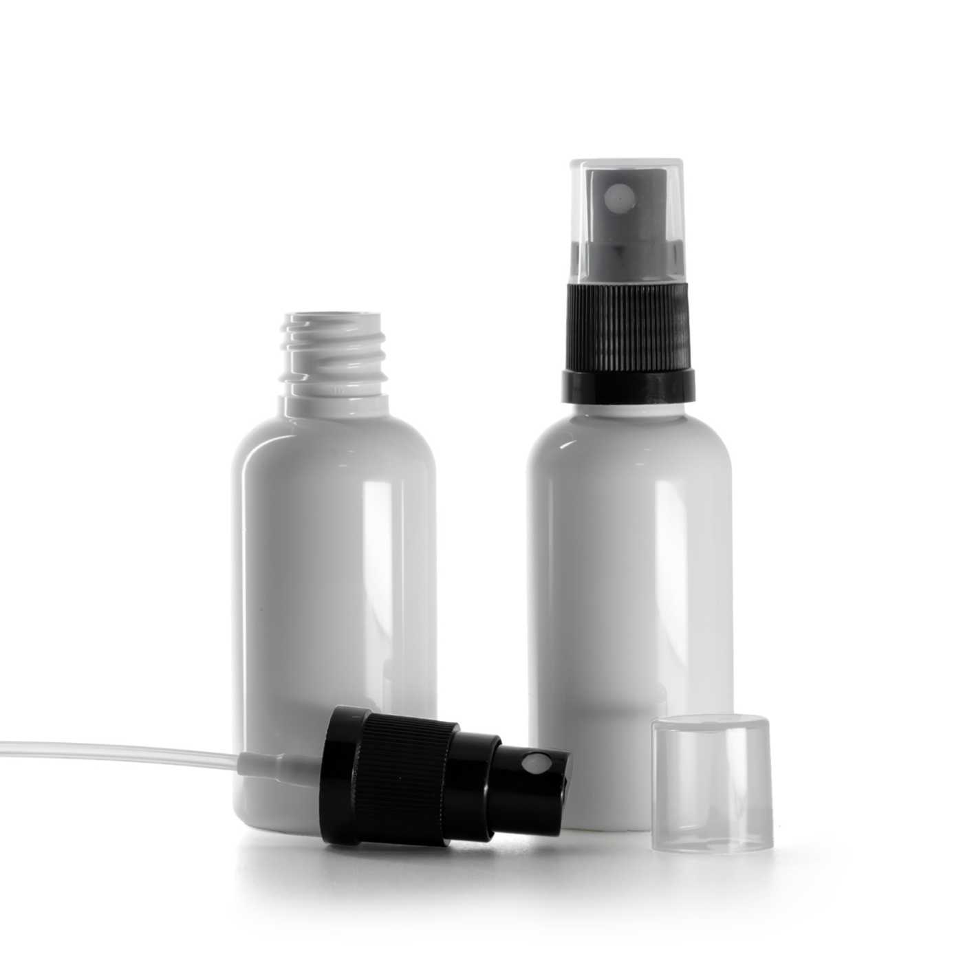 Fehér műanyag flakon, fekete permetezőfej, 50 ml