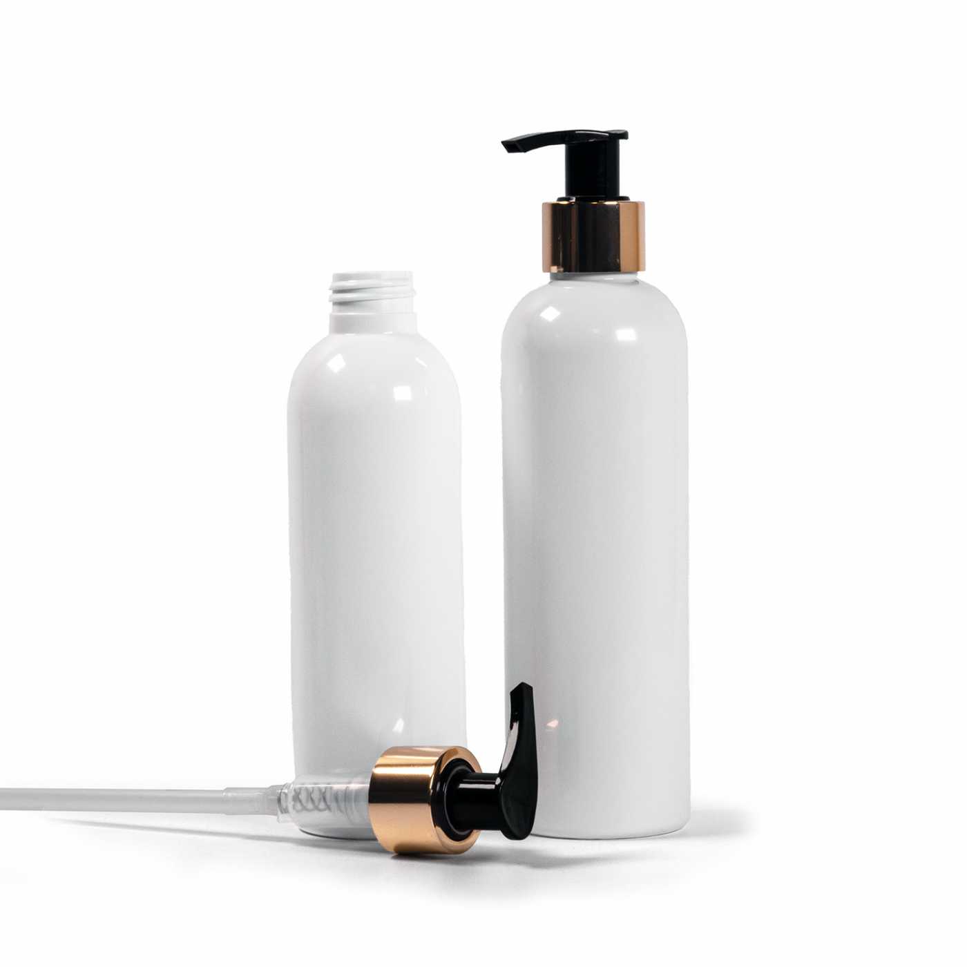 Fehér műanyag palack arany szivattyúval, 200 ml