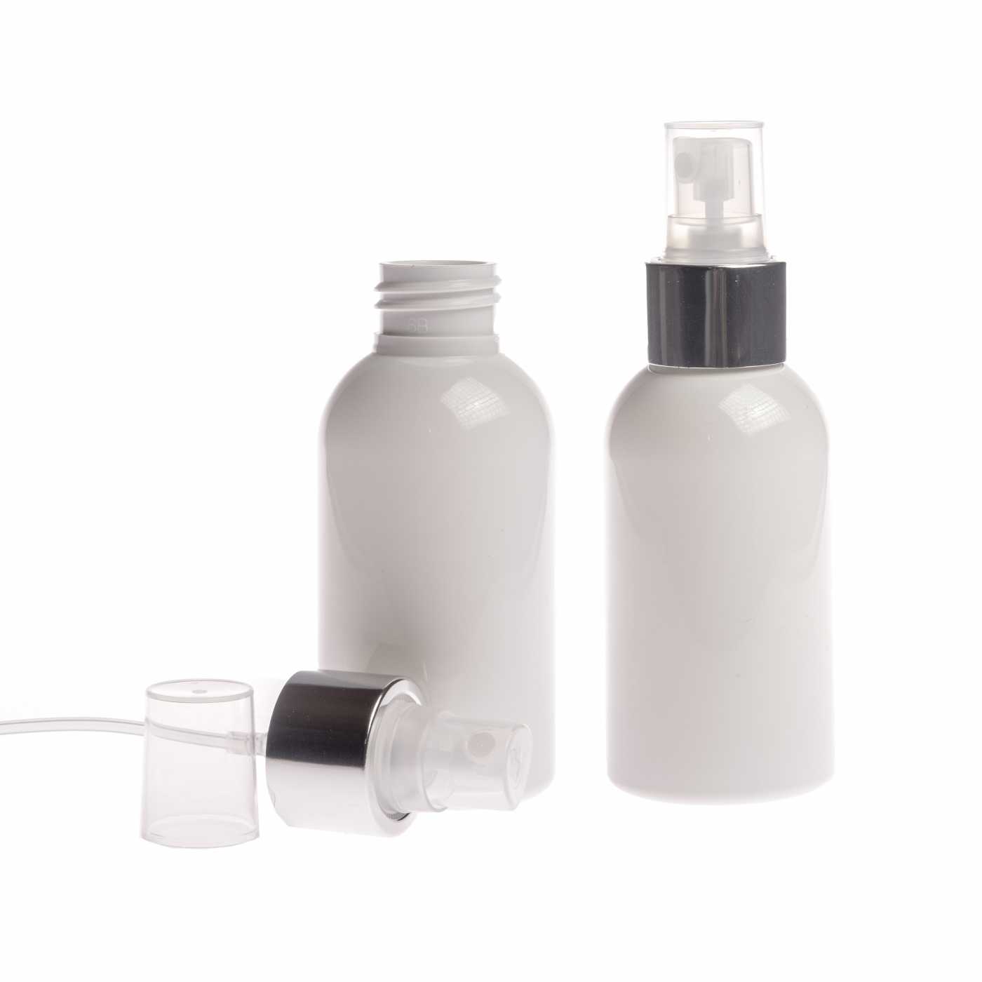 Fehér műanyag palack áttetsző permetezőfejjel és fényes ezüst gyűrűvel, 100 ml