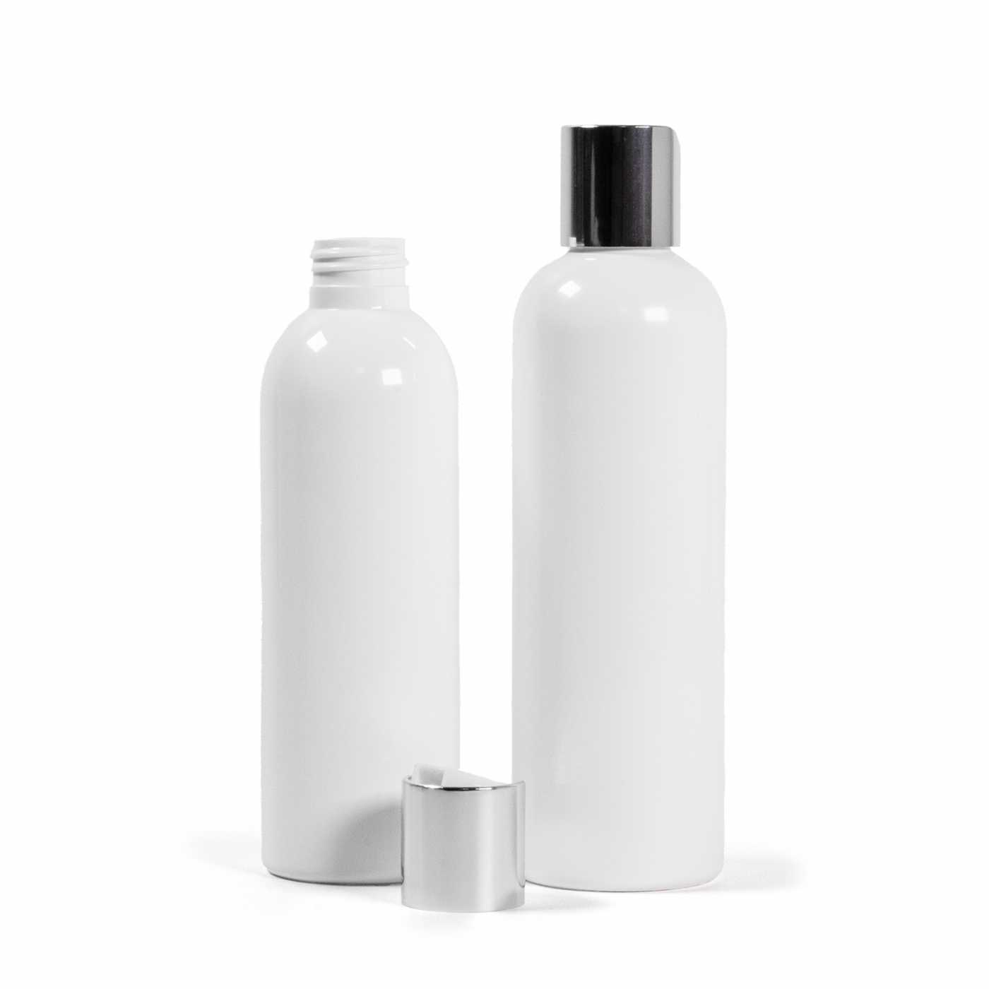 Fehér műanyag palack, ezüst flip‑top kupak, 250 ml