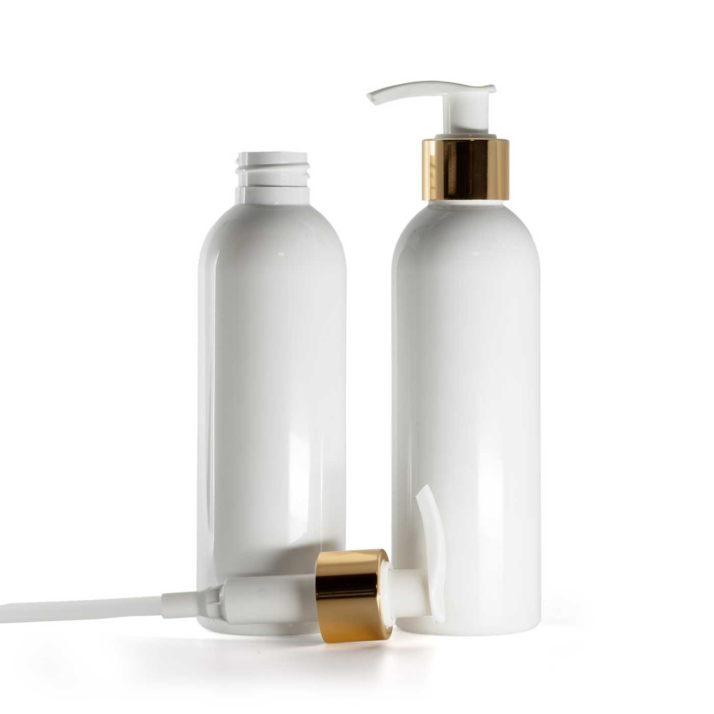 Fehér műanyag palack, fehér adagolópumpa fényes arany gallérral, 200 ml