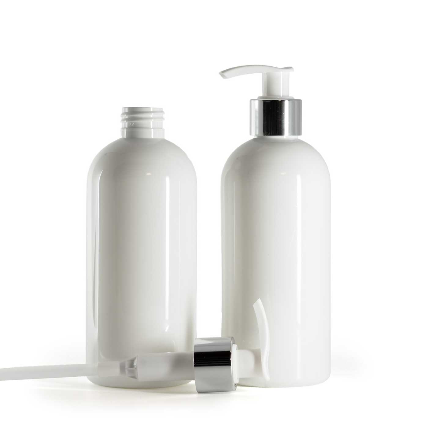 Fehér műanyag palack, fehér adagolószivattyú fényes ezüst gallérral, 300 ml