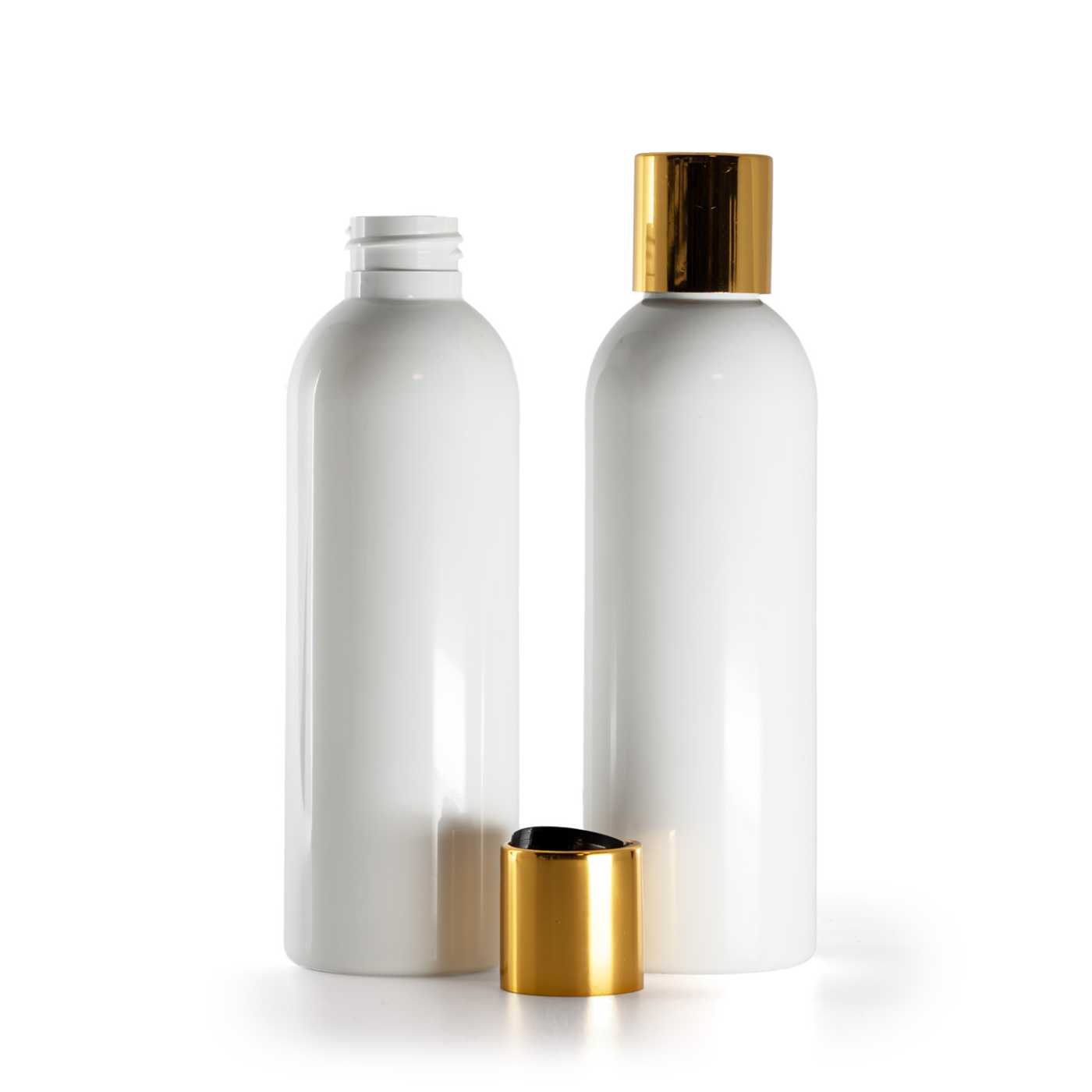 Fehér műanyag palack, fekete disc top kupak aranyszínű alumíniumgyűrűvel, 200 ml