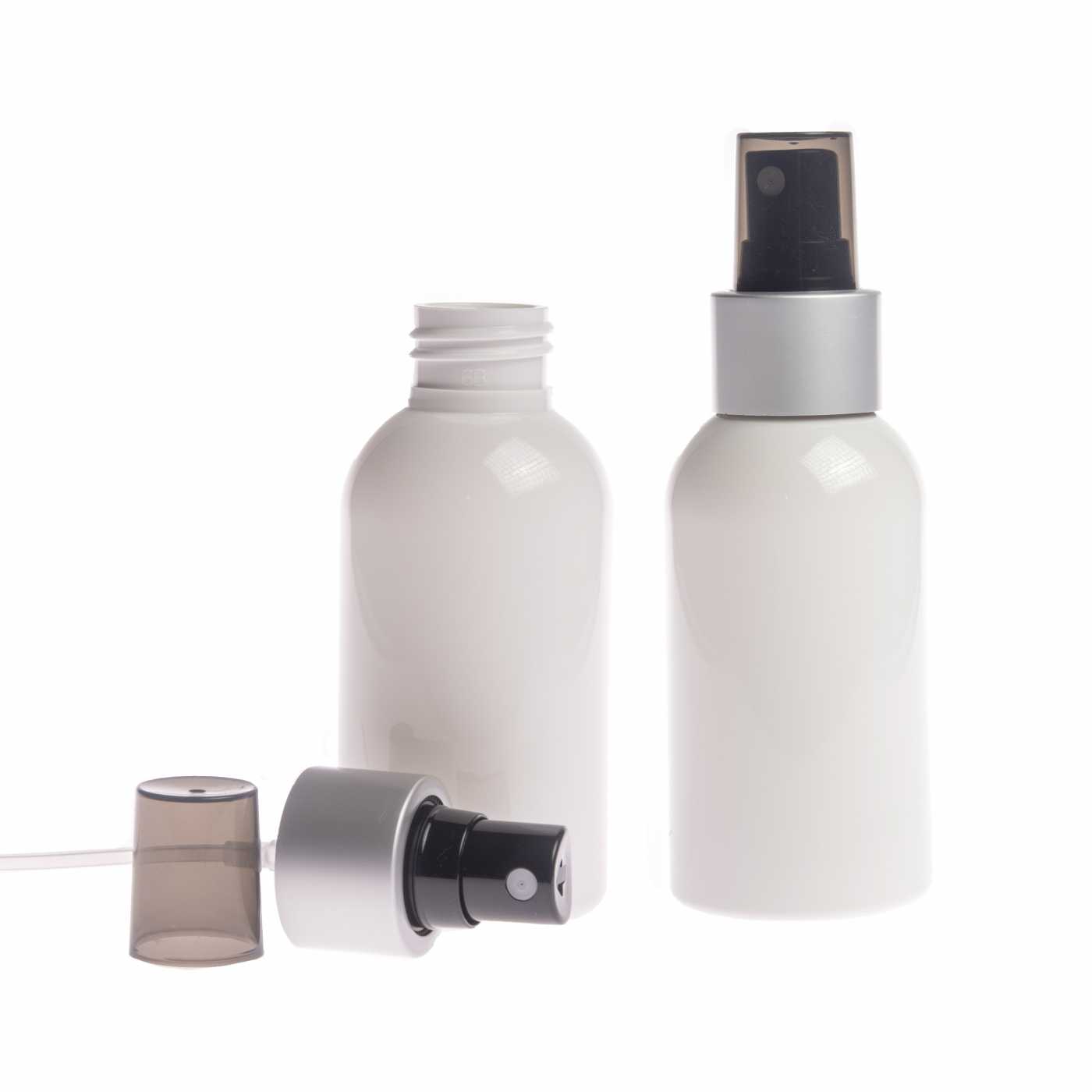 Fehér műanyag palack fekete permetezőfejjel és matt ezüst gyűrűvel, 150 ml