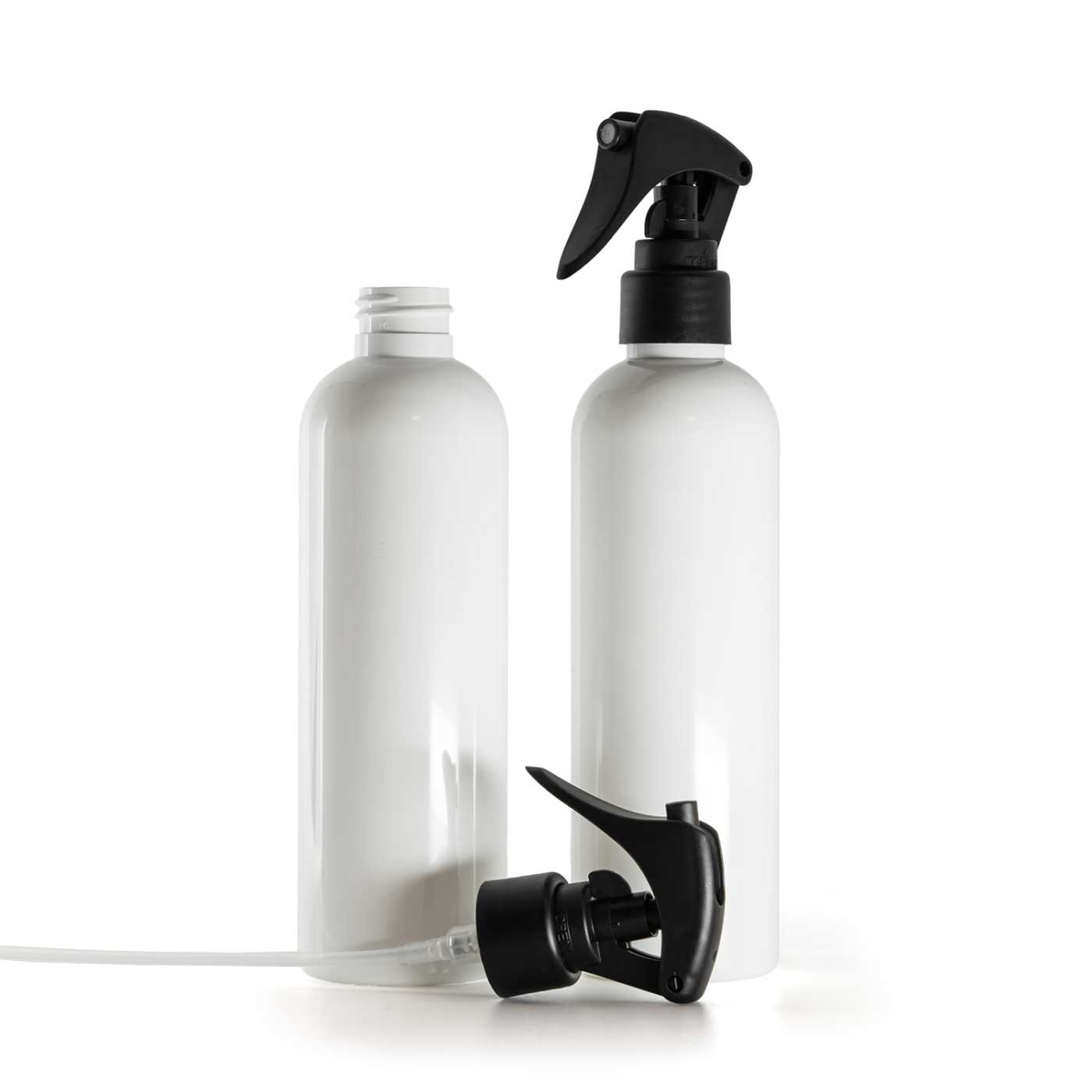 Fehér műanyag palack, mini ravaszos permetező matt fekete, sima gyűrű, 250 ml