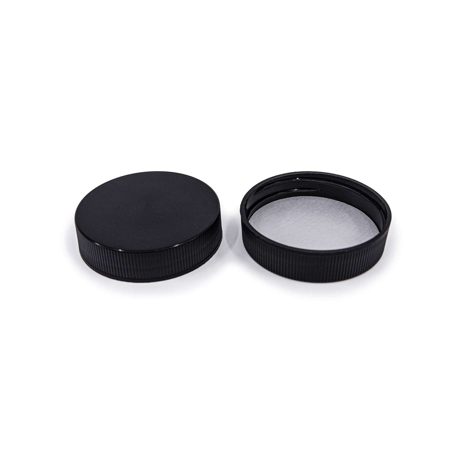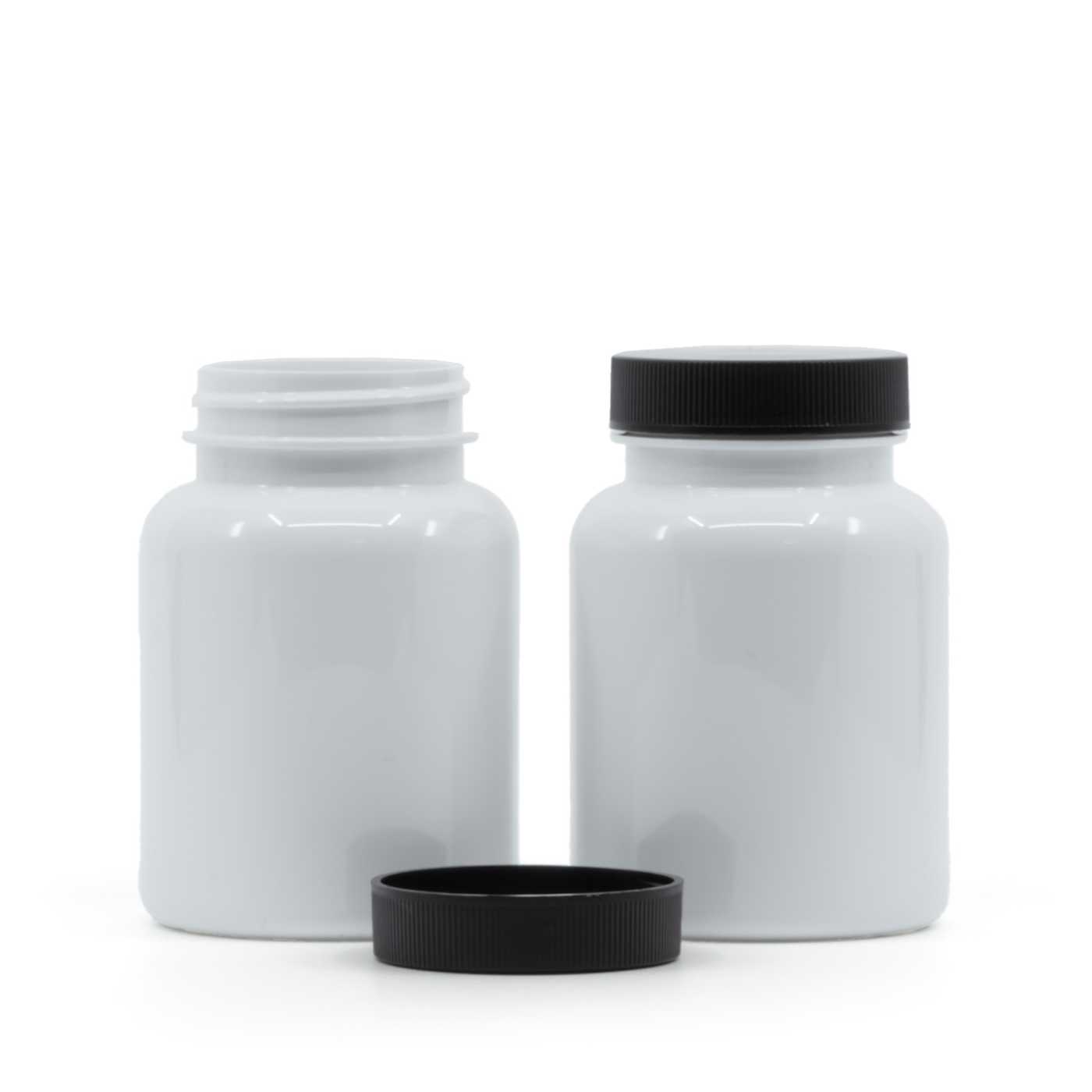 Fehér műanyag tablettás tégely fekete kupakkal, 150 ml
