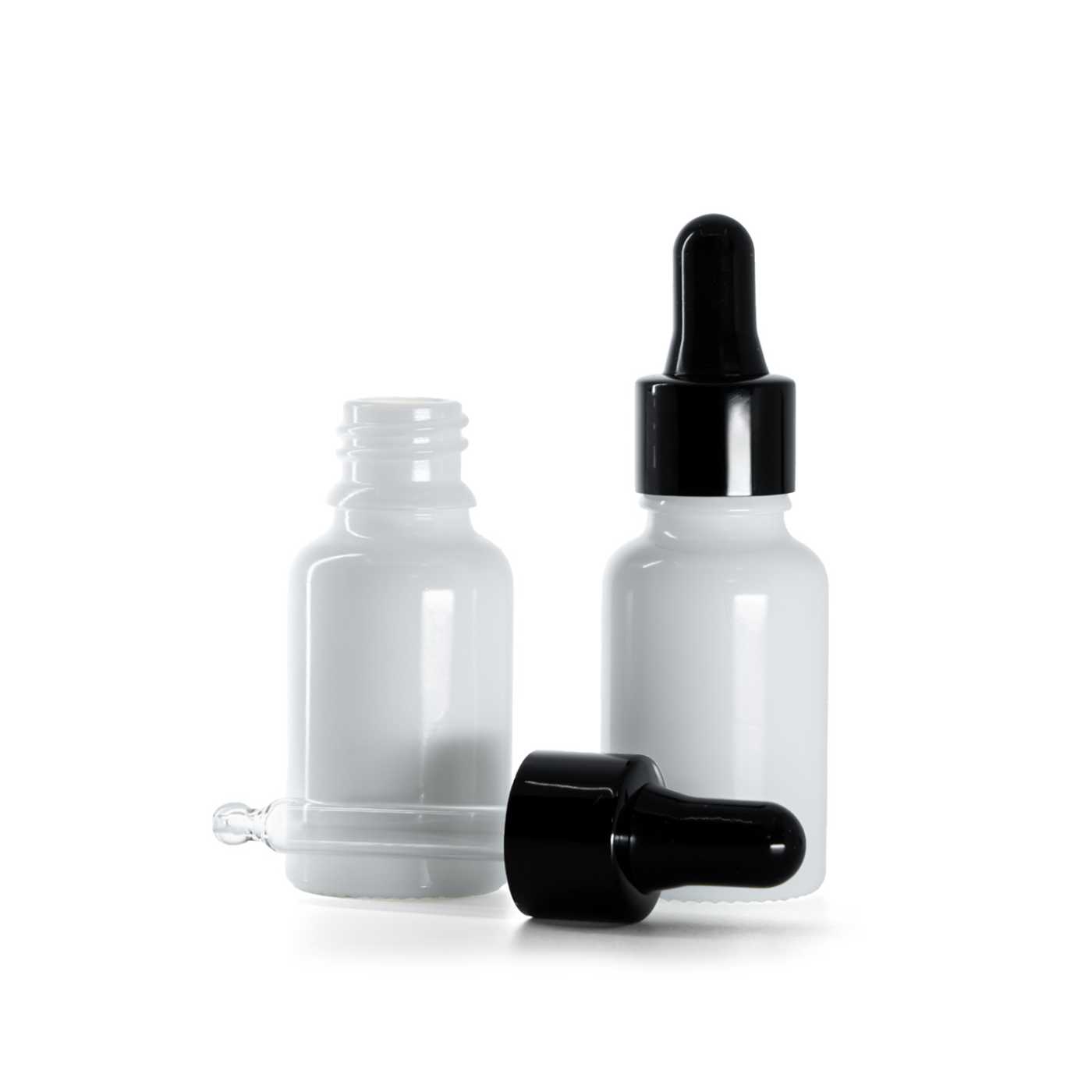 Fehér üveg cseppentős üveg fényes fekete pipettával, 15 ml