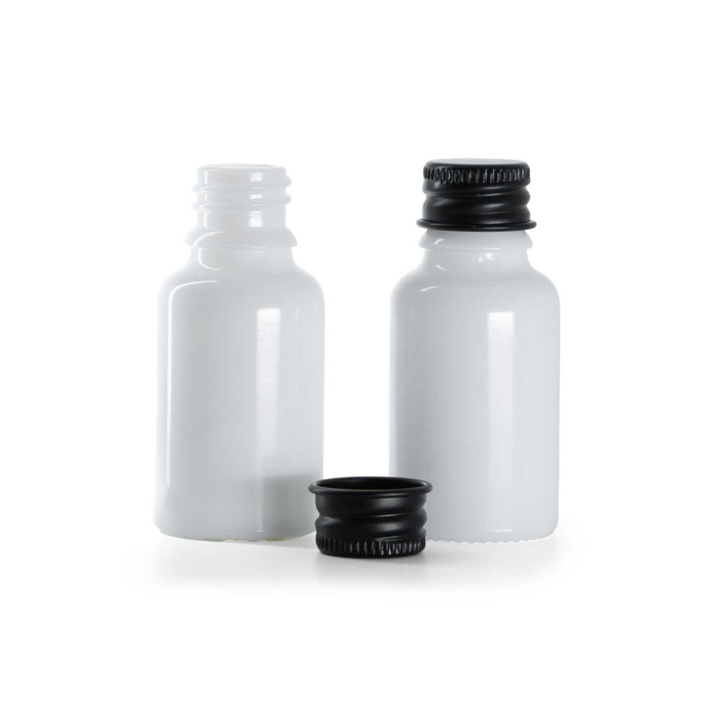 Fehér üvegpalack, fekete alumínium kupak, 15 ml