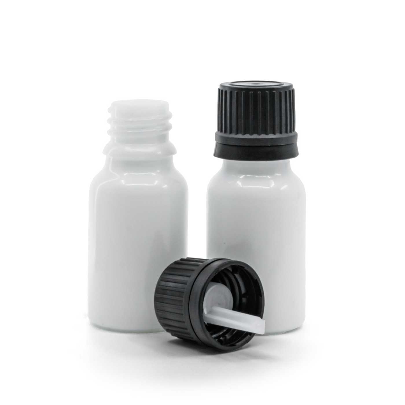 Fehér üvegpalack, fekete cseppentős kupak, 10 ml